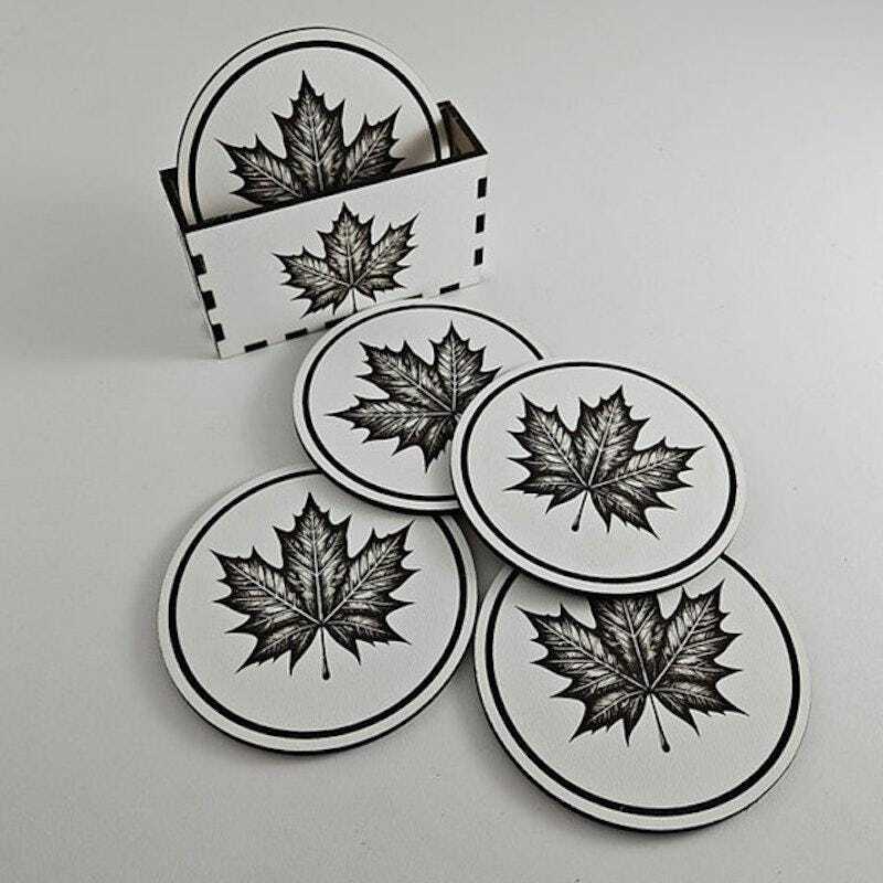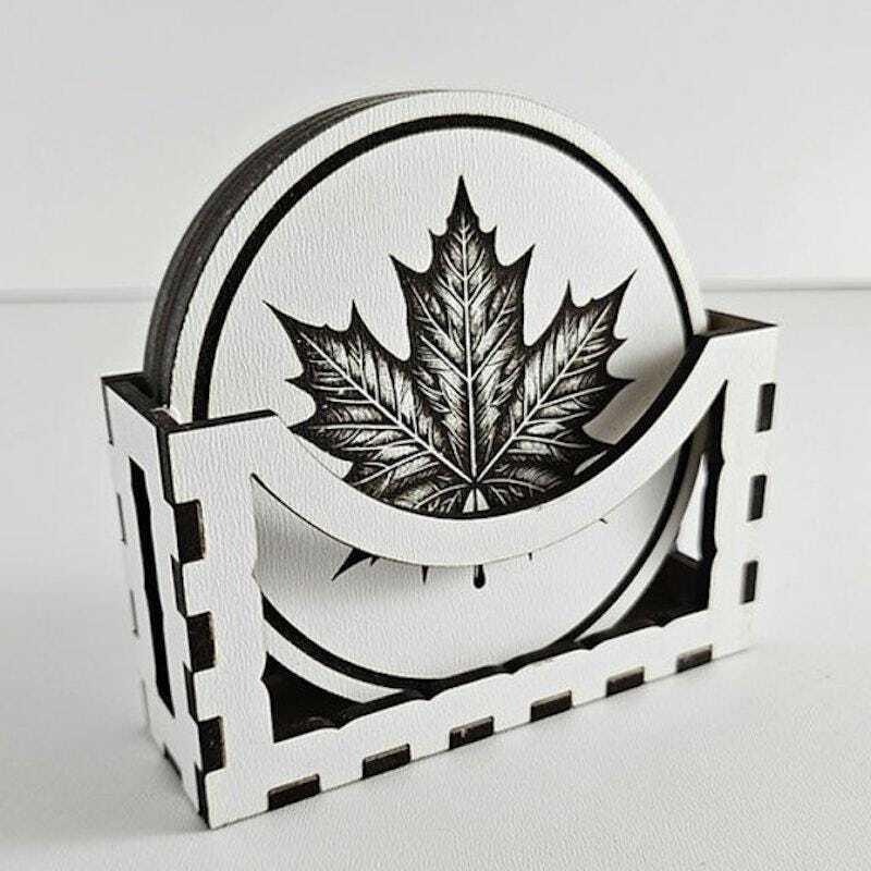 This set includes 5 wooden coasters, each shaped like a leaf and delicately laser-cut for a natural and elegant look. The matching wooden storage box keeps them organized when not in use.