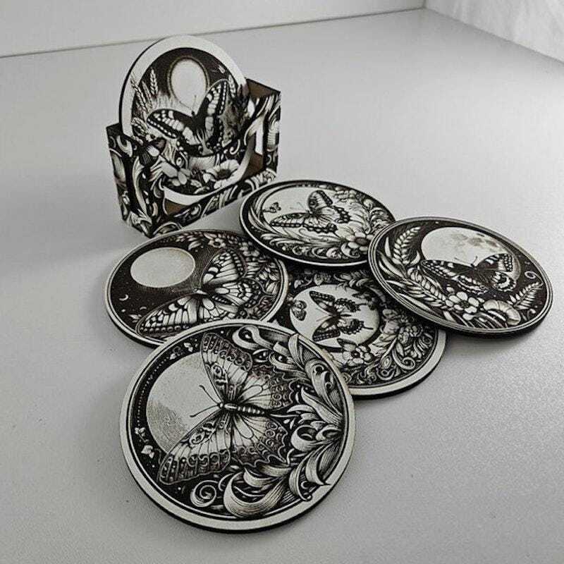 6 engraved wooden coasters with butterfly designs