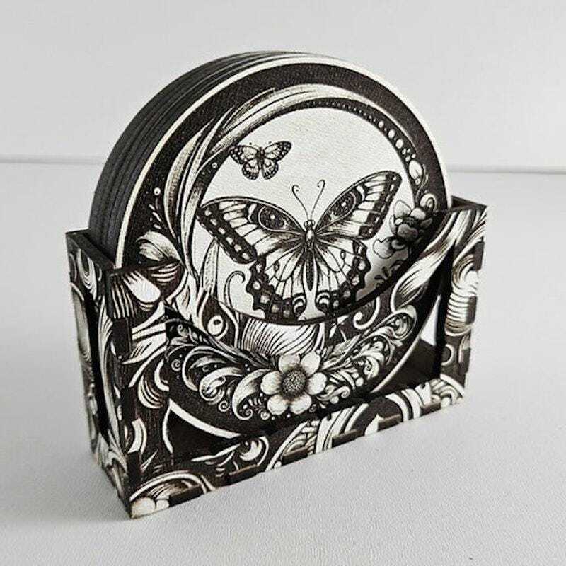 This charming butterfly-themed coaster set features 6 handcrafted wooden coasters, each engraved with elegant butterfly designs. Complete with a matching wooden storage box, it?s the perfect blend of natural inspiration, functionality, and artisanal craftsmanship.