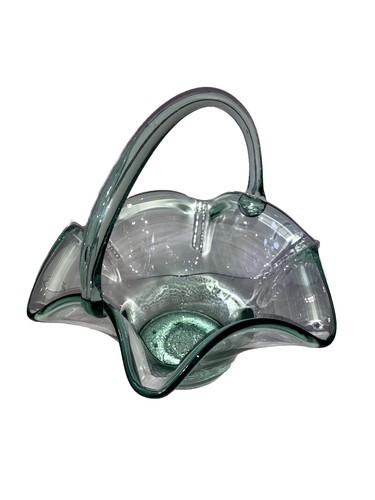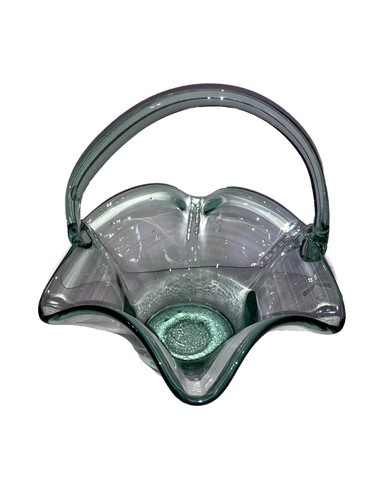 This vintage blown sea foam clear green glass basket is a unique and decorative piece for any art-themed space. Handmade with a height of 8 inches with handle and a diameter of 9 inches, this original art glass item features intricate hand-blown craftsmanship. The sea foam green color adds a touch of nature to its artistic design, making it a standout decorative piece for your home. With its unmarked brand and distinctive features, this basket is sure to add a touch of vintage charm to any room.