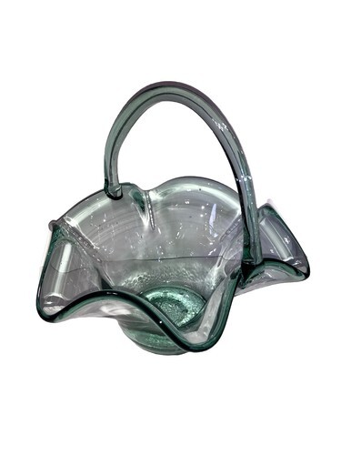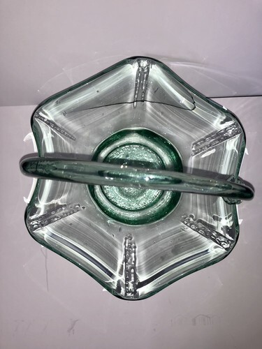 Vintage Blown Sea Foam Clear Green Glass Basket w/ Handle 8” Tall 9” Diameter