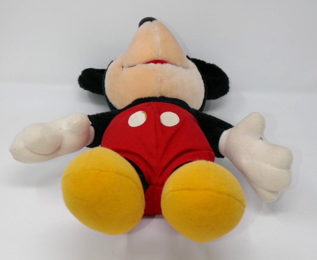 The Hasbro Softies Vintage 1983 Disney Mickey Mouse Plush Stuffed Doll is a nostalgic collectible featuring the beloved character from Disney's Mickey Mouse franchise. This measures approx. 15" including the ears with some wear from age. His eyes have yellowed and the glue is showing on one of his buttons. With its vintage appeal and connection to the iconic Mickey Mouse brand, this plush doll is a timeless treasure that will surely delight fans of all ages.