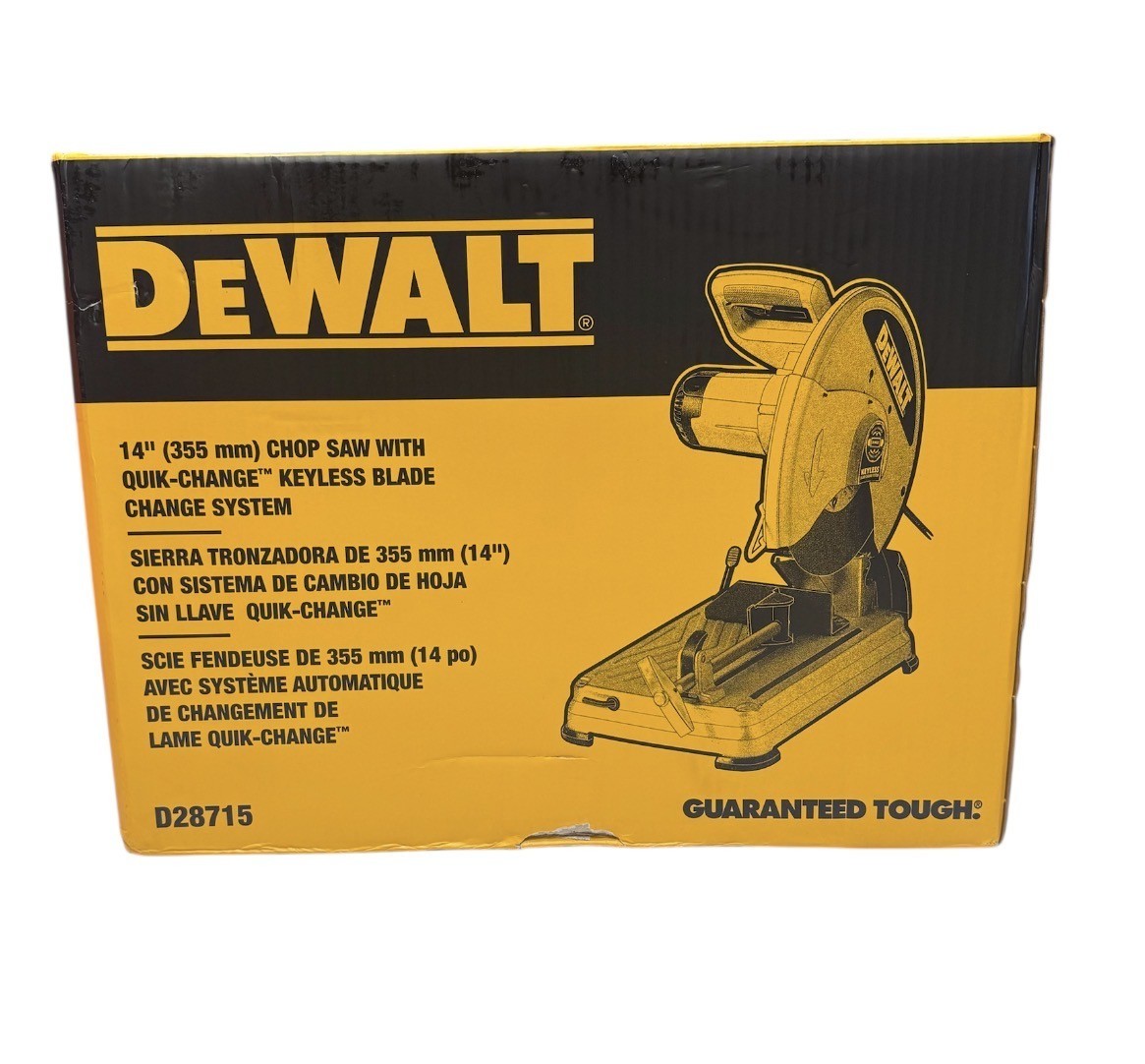 Category: Power equipmentType: SawBrand: DewaltModel number: D28715 - Chop SawSize: 14"Color: Yellow/BlackPower source: ElectricModel name: 15 Amp Corded 14 in. Cut-Off SawCondition:New (Open Box)