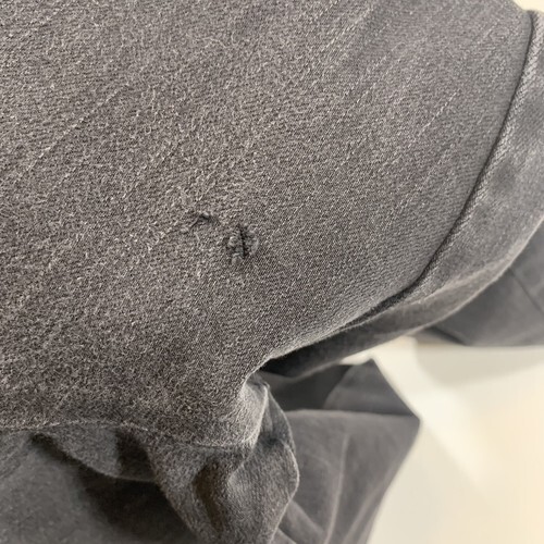 There are two small holes in the seat of the pants. These may be able to be stitched/repaired. See photos for flaws