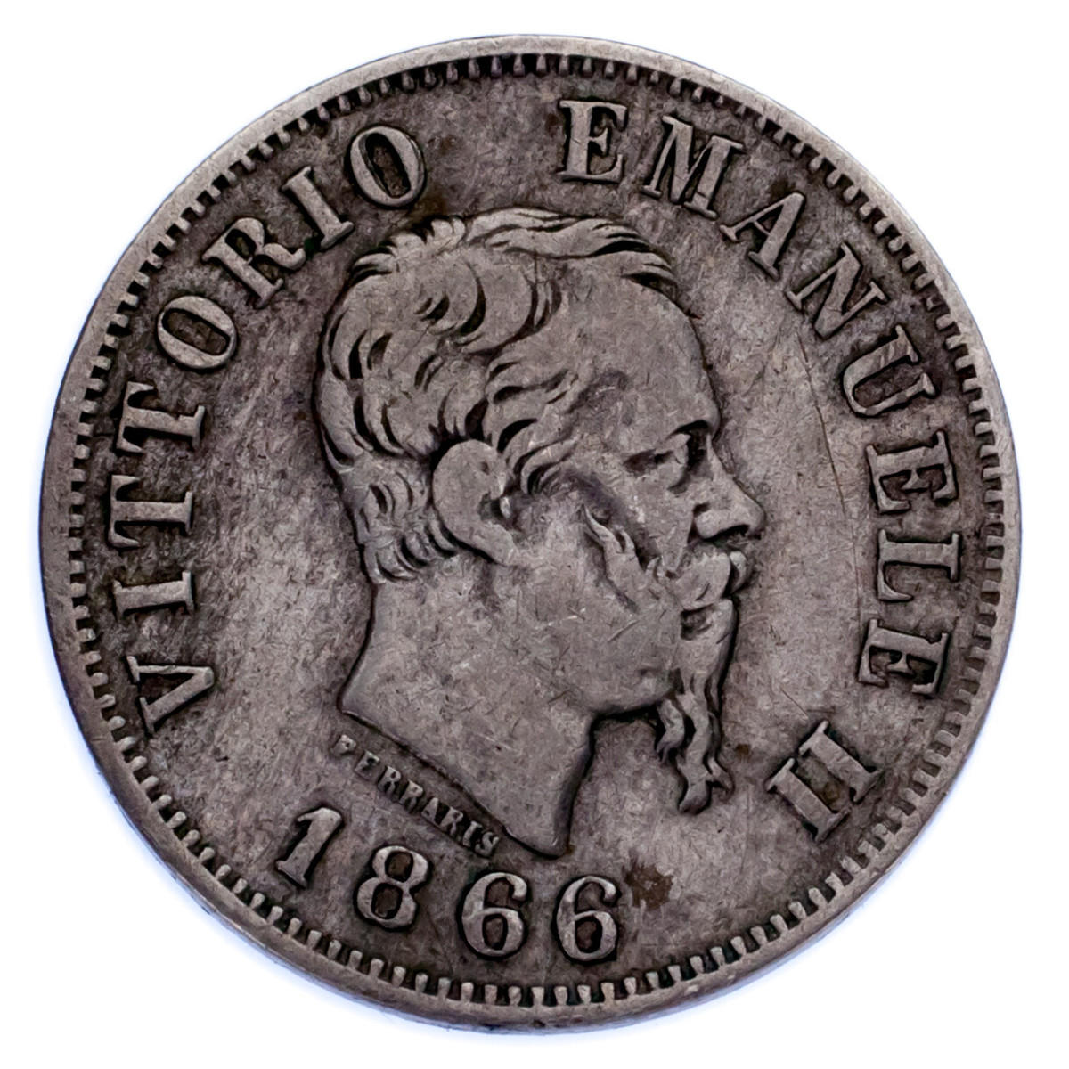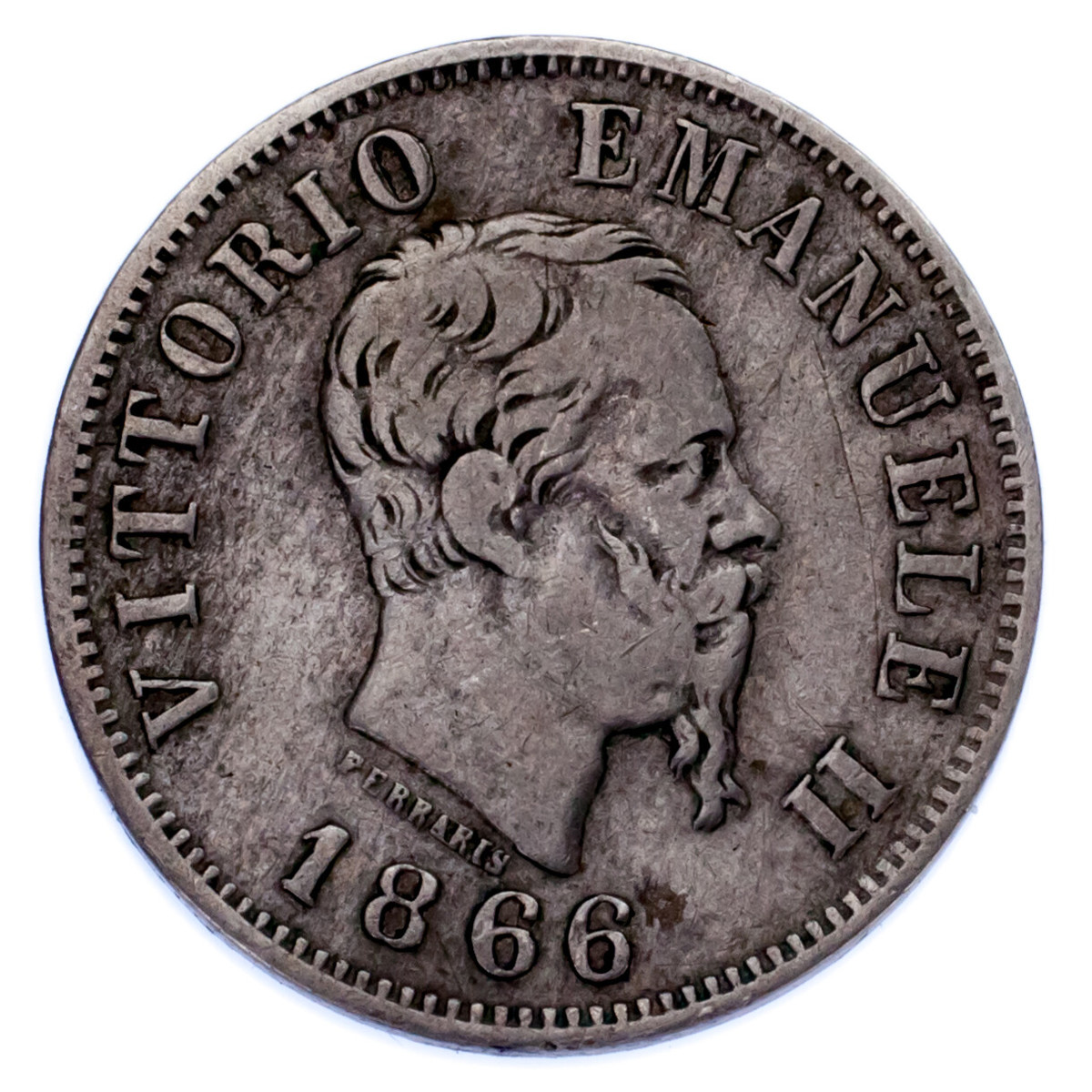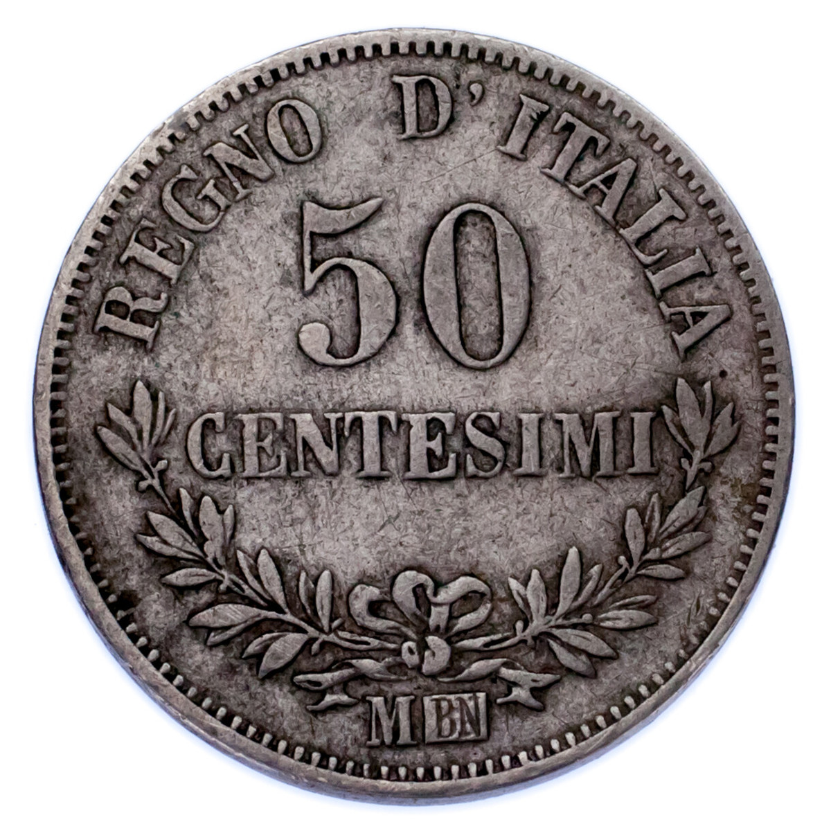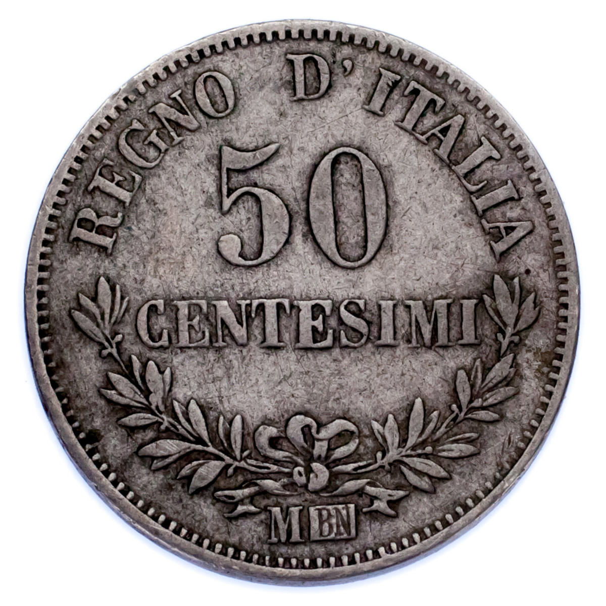 1866 Italy 50 Centesimi Coin (VF Condition) KM 14.1