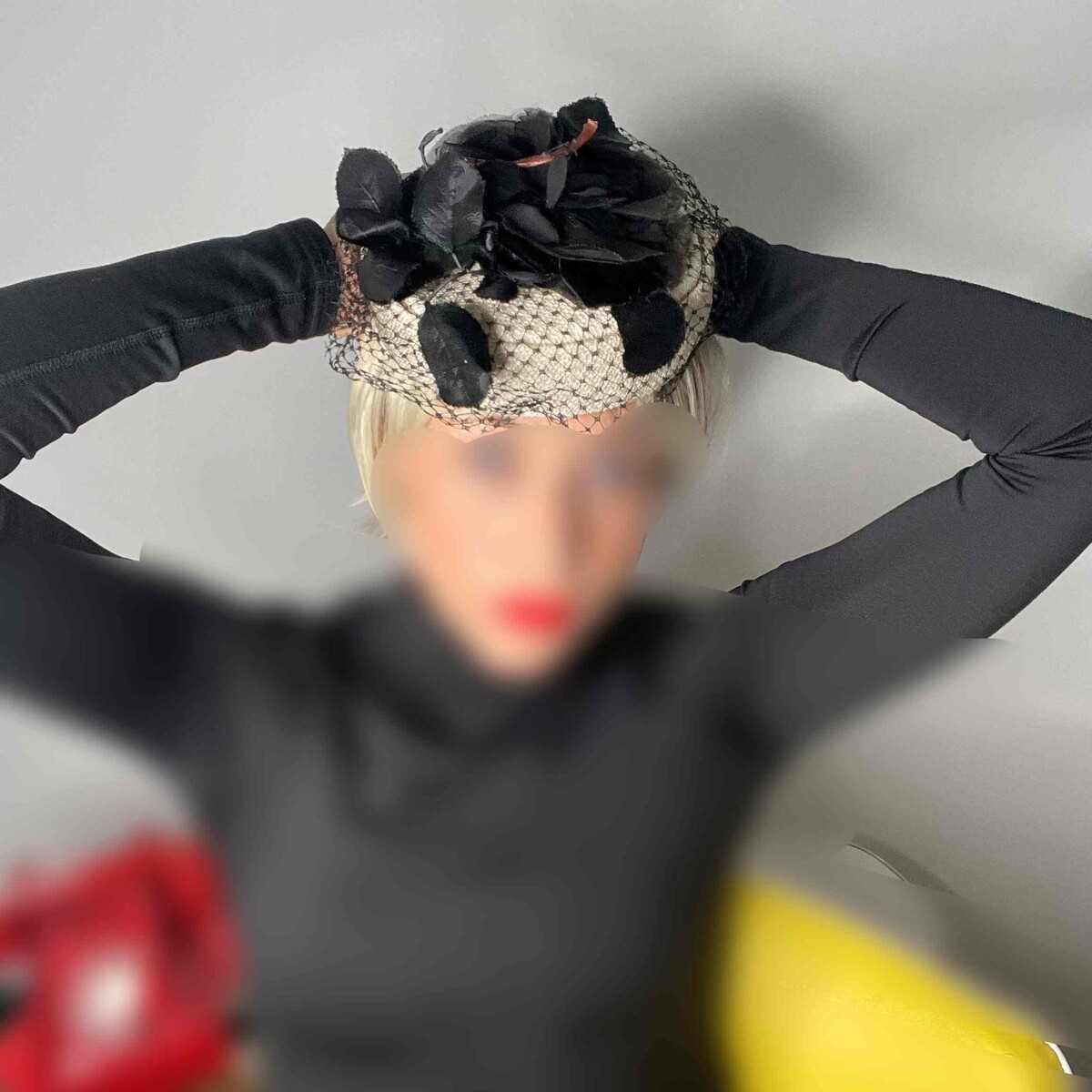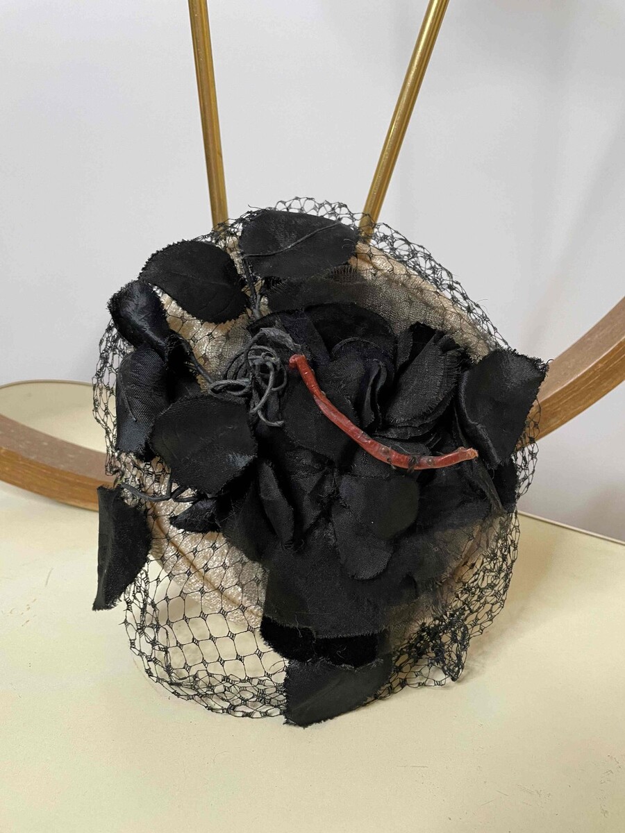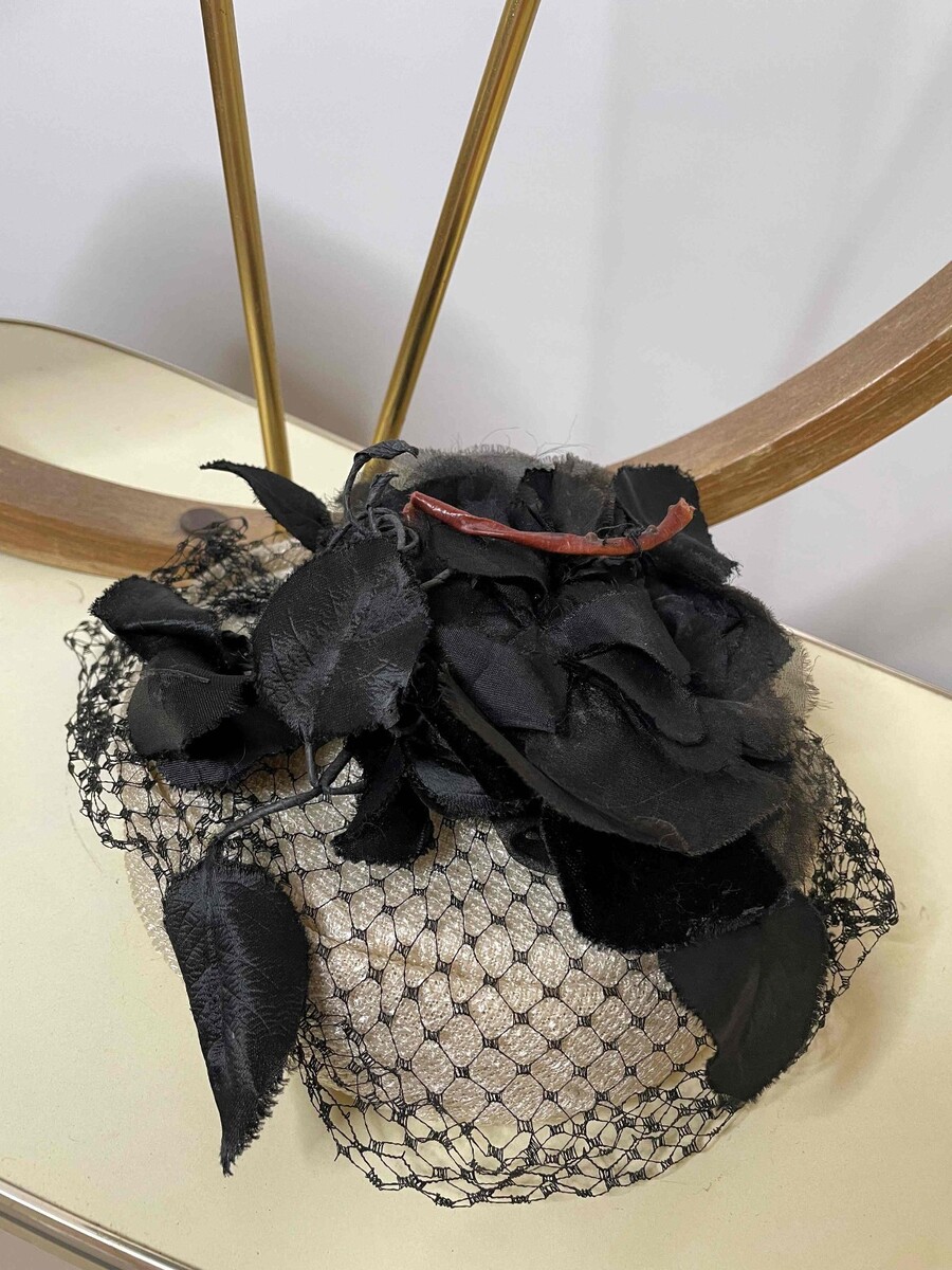 This little hat has a large handmade black rose attached to the top. The rose is made from velvet and sheer black fabric of the period
