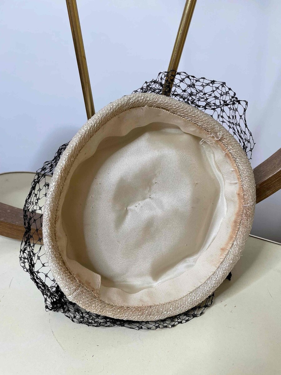 This hat is around 70 years old it is not new. The hat is strong and ready to wear. The rose atop of the handmade pillbox could be sewn in place a little more and is held by just a few stitches. The netting and flower attest to the authenticity of this vintage hat, inside the hat there are some markup marks. It really looks gorgeous on and is ready to wear or to display.