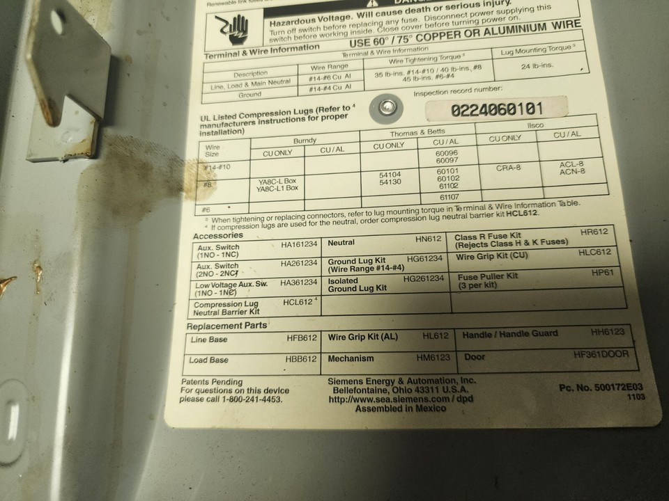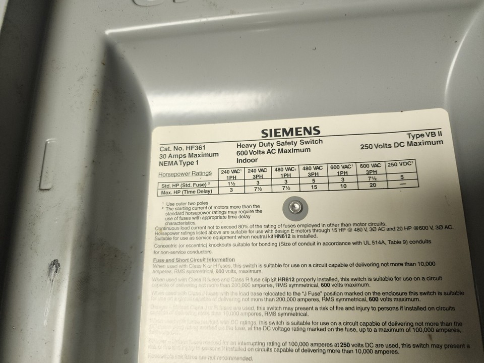 Siemens HF361 Heavy Duty, 600VAC, 250VDC, 30 A, 3 Pole, Fusible Disconnect, Safety Switch