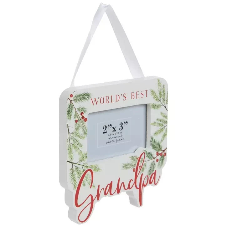 Add some meaningful decorations to your tree with this World's Best Grandpa Photo Frame Ornament. This MDF ornament features a white frame decorated with pine needles and red berries. In the center is a small spot for a picture that is covered by a glass panel. Slip a picture of you and your grandpa into the frame, and then use the ribbon to hang it on your Christmas tree!