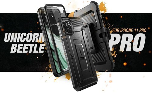 Blue onn rugged case for iPhone 11/XR with rotating holster clip.