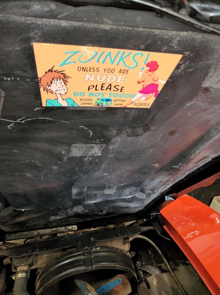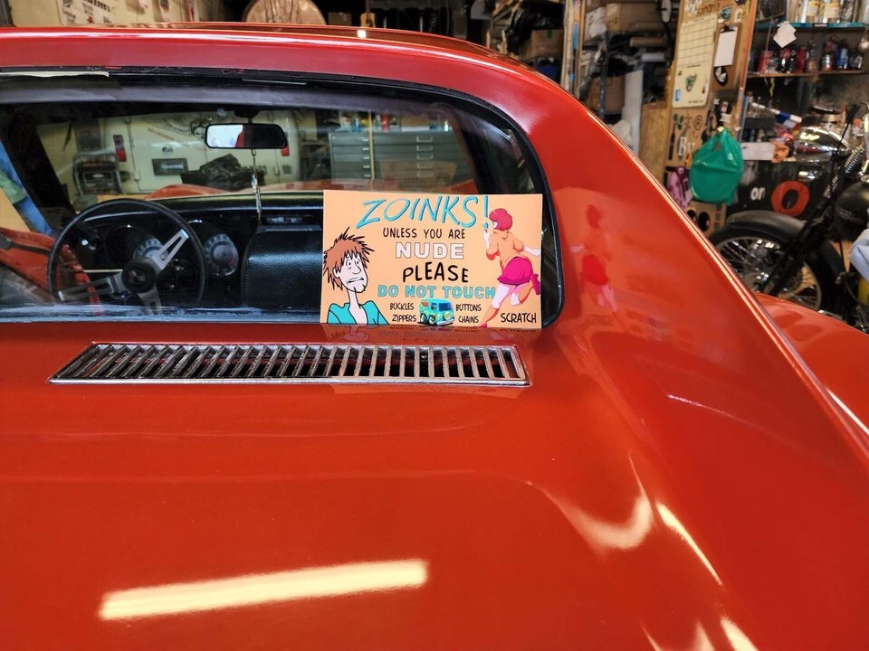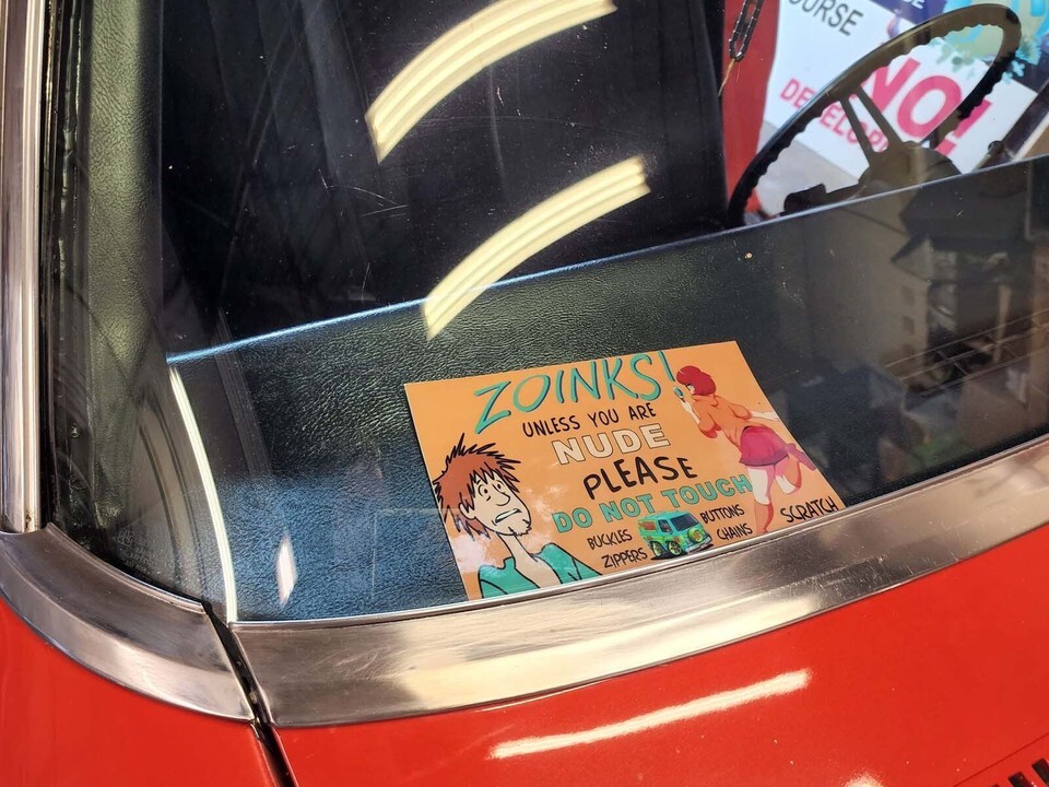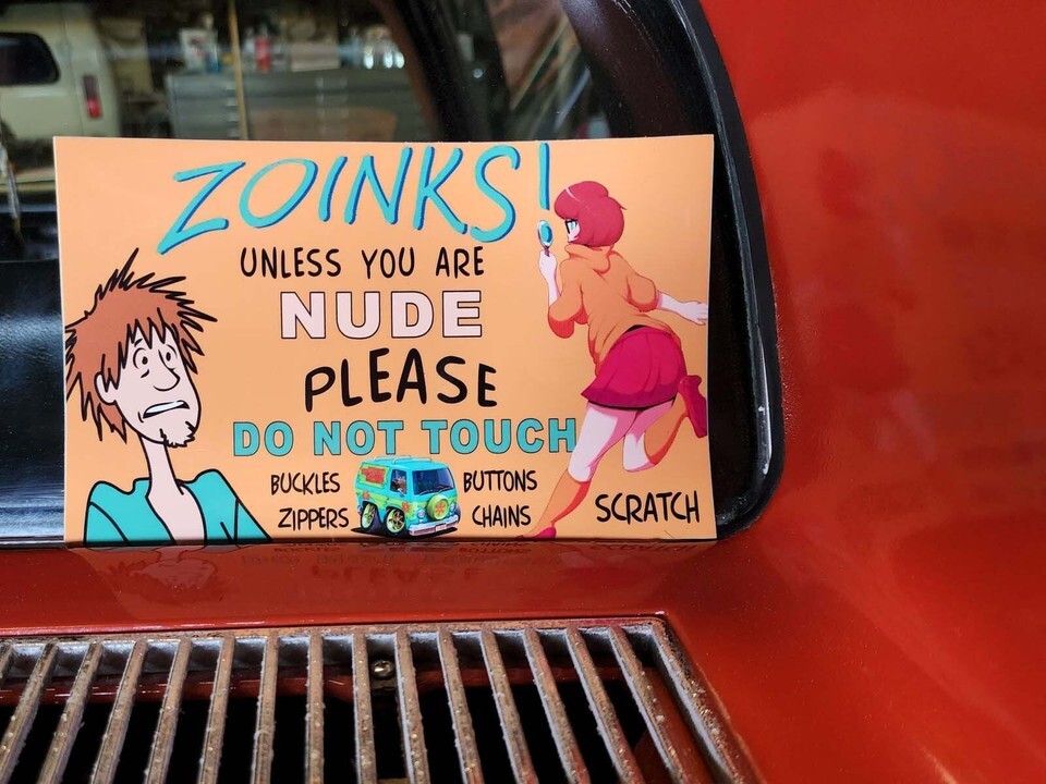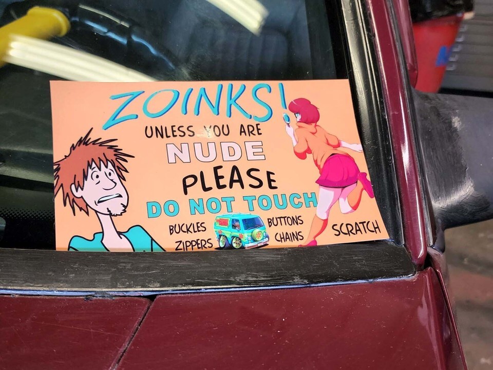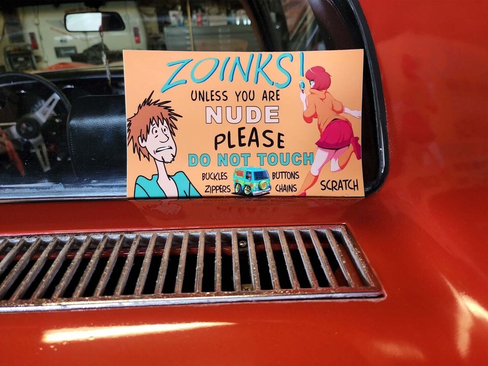 "ZOINKS! Unless you are Nude please Do Not Touch". This is a vinyl sticker/decal that you can use by itself or adhere to a plaque/stand that sits in your dash.
