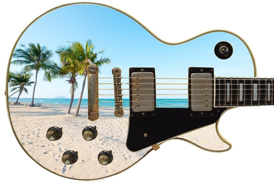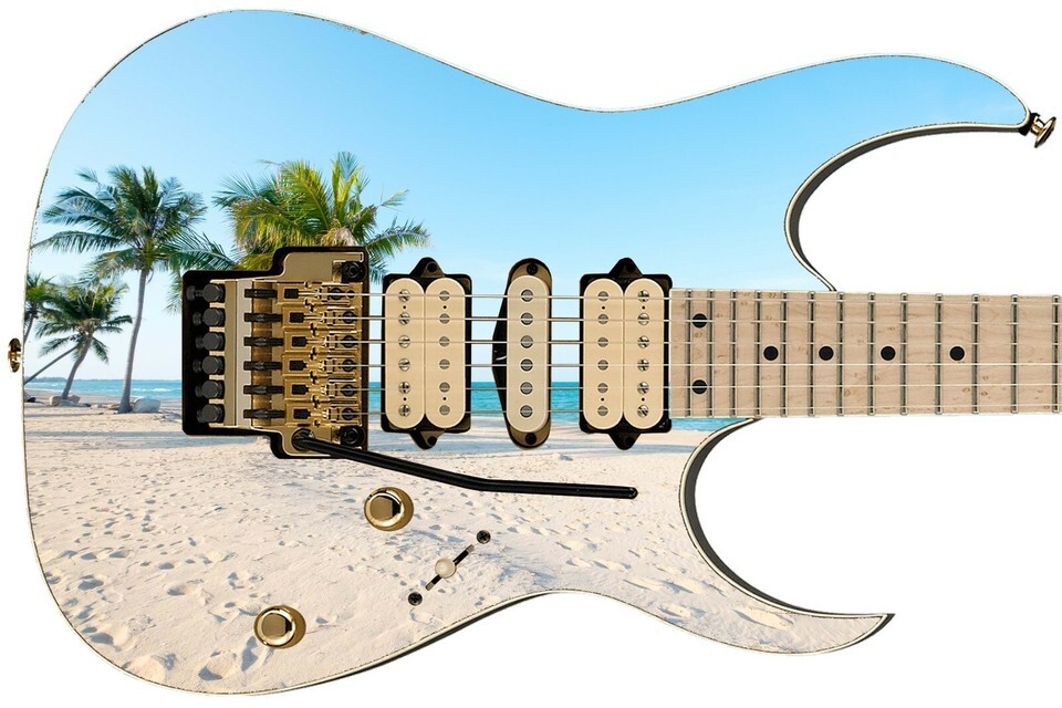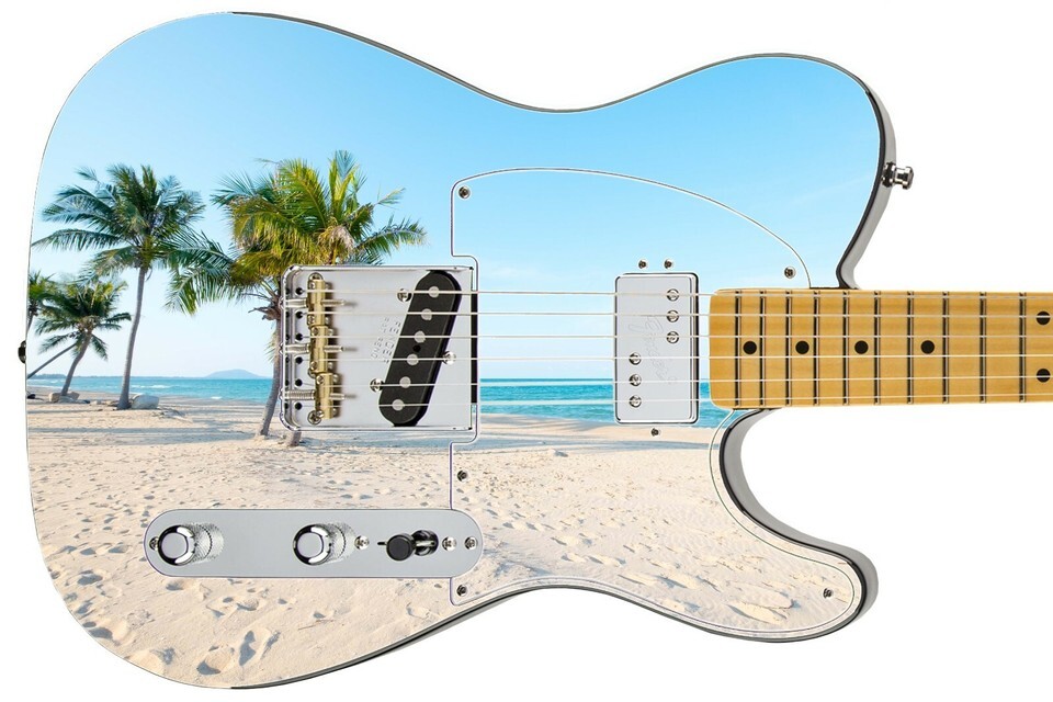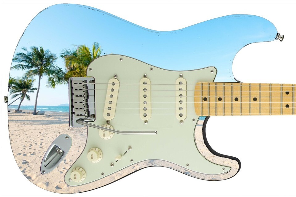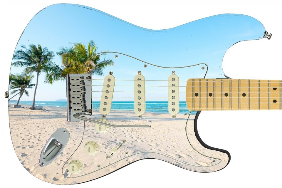 Guitar Skin Electric Axe Wrap Reskin Bass Reface Paradise City Sandy Beach 489