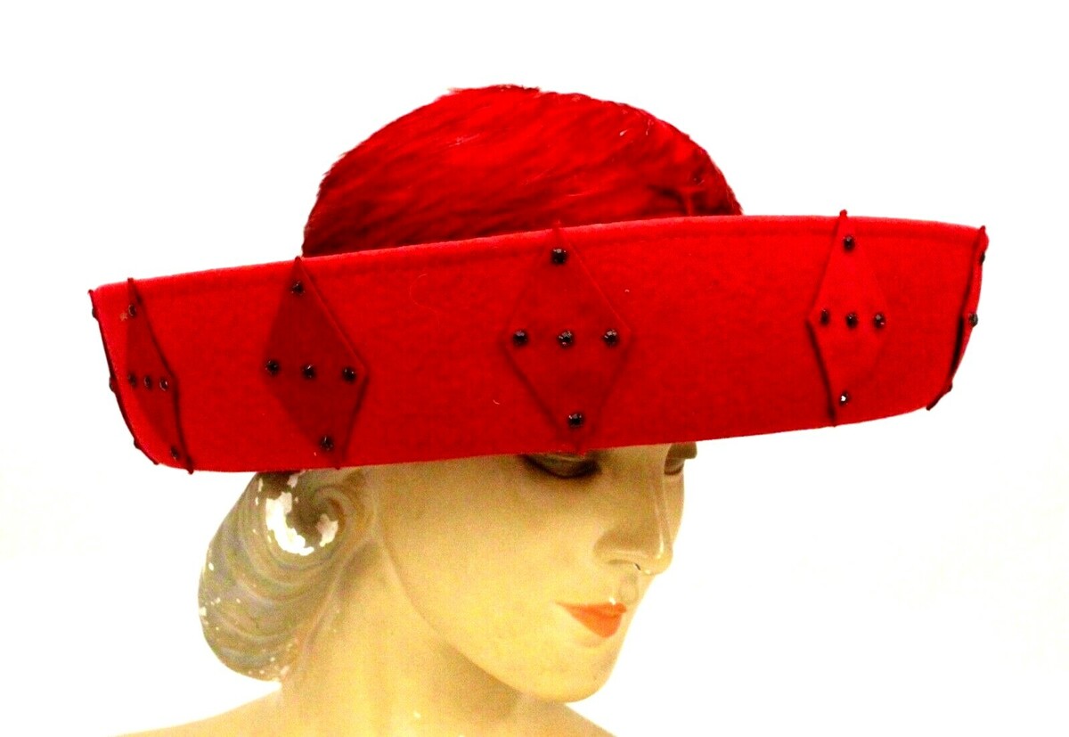 Vintage B Michael Women's Church Red Hat Red Feather Crown Diamond Trim 1980s