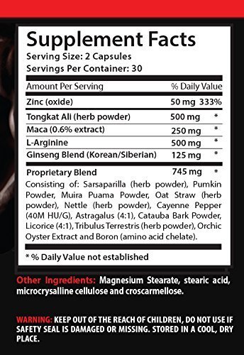 Consisting of: Sarsaparill (herb powder), Pumkin Powder, Muira Puama Powder, Oat Straw (herb powder), Nettle (herb powder), Cayenne Pepper(40M HU/G), Astragalus (4:1), Catauba Bark Powder, Licorice (4:1), Tribulus Terrestris (herb powder), Orchi Oyster Extract and Boron (amino acid chelate).