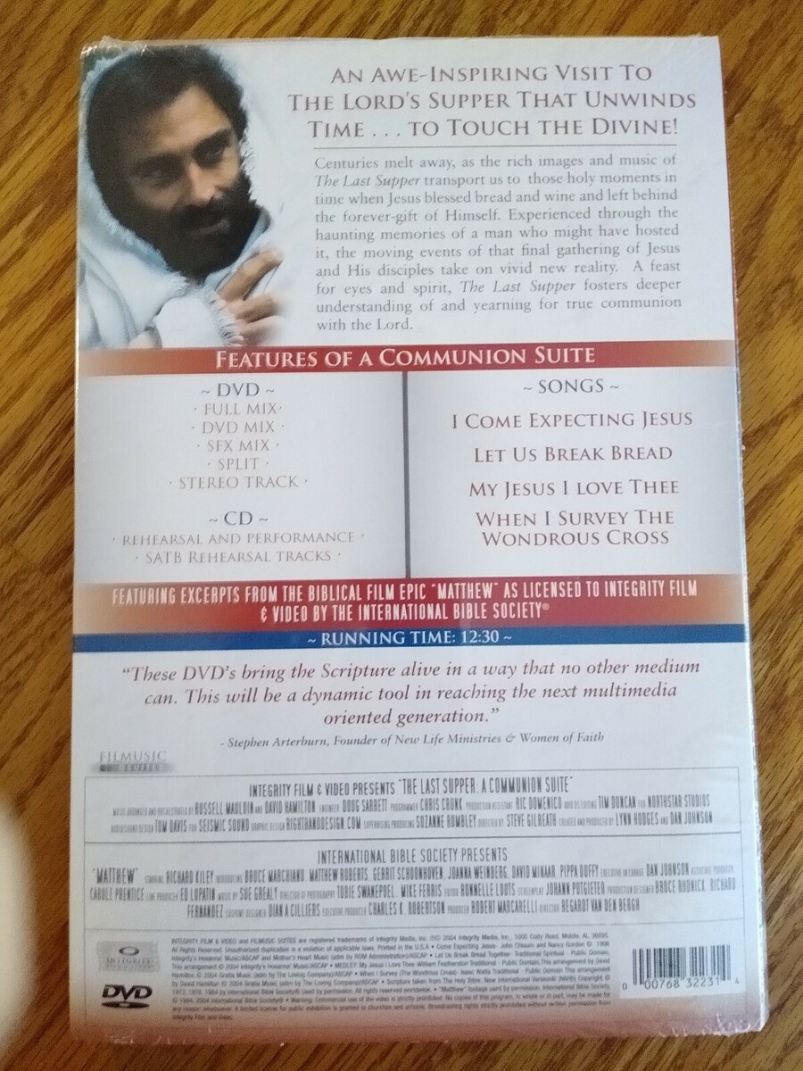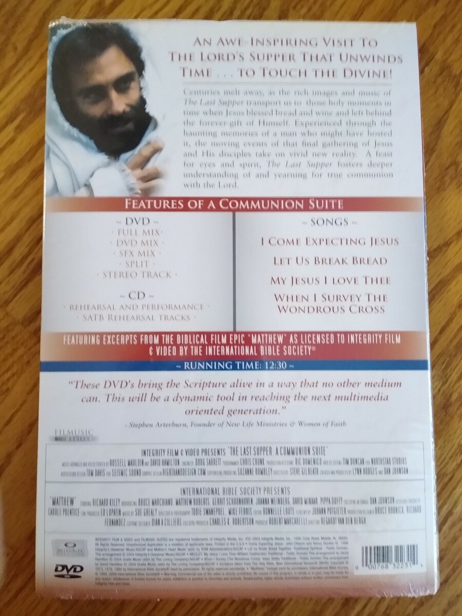 New, Never opened. The Last Supper, A Communion Suite is a 12 minute Communion Service for Choirs and Congregations. It features 4 hymns of Reflection: I Come Expecting Jesus, Let Us Break Bread, My Jesus I Love Thee When I Survey The Cross. Contains DVD - Full Mix, DVD Mix, SFX Mix, Split, Stereo Track plus CD - Rehearsal Performance SATB Rehearsal Tracks
