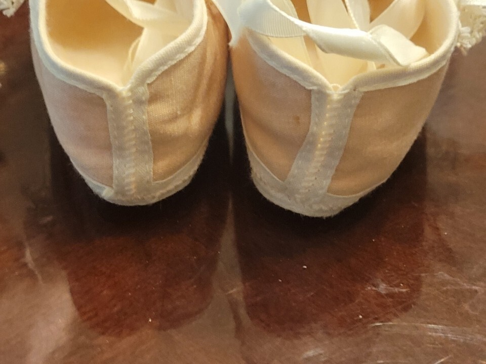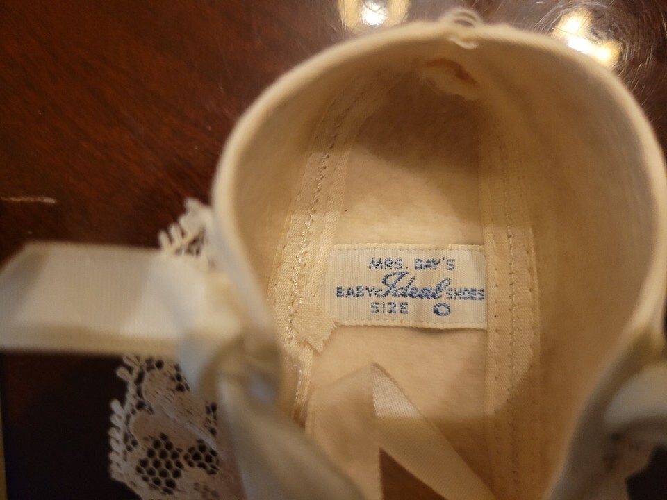 Beautiful Lace trimmed baby shoes, made by Mrs Day's Ideal Baby Shoe Co. in Danvers Mass. Made in the USA.