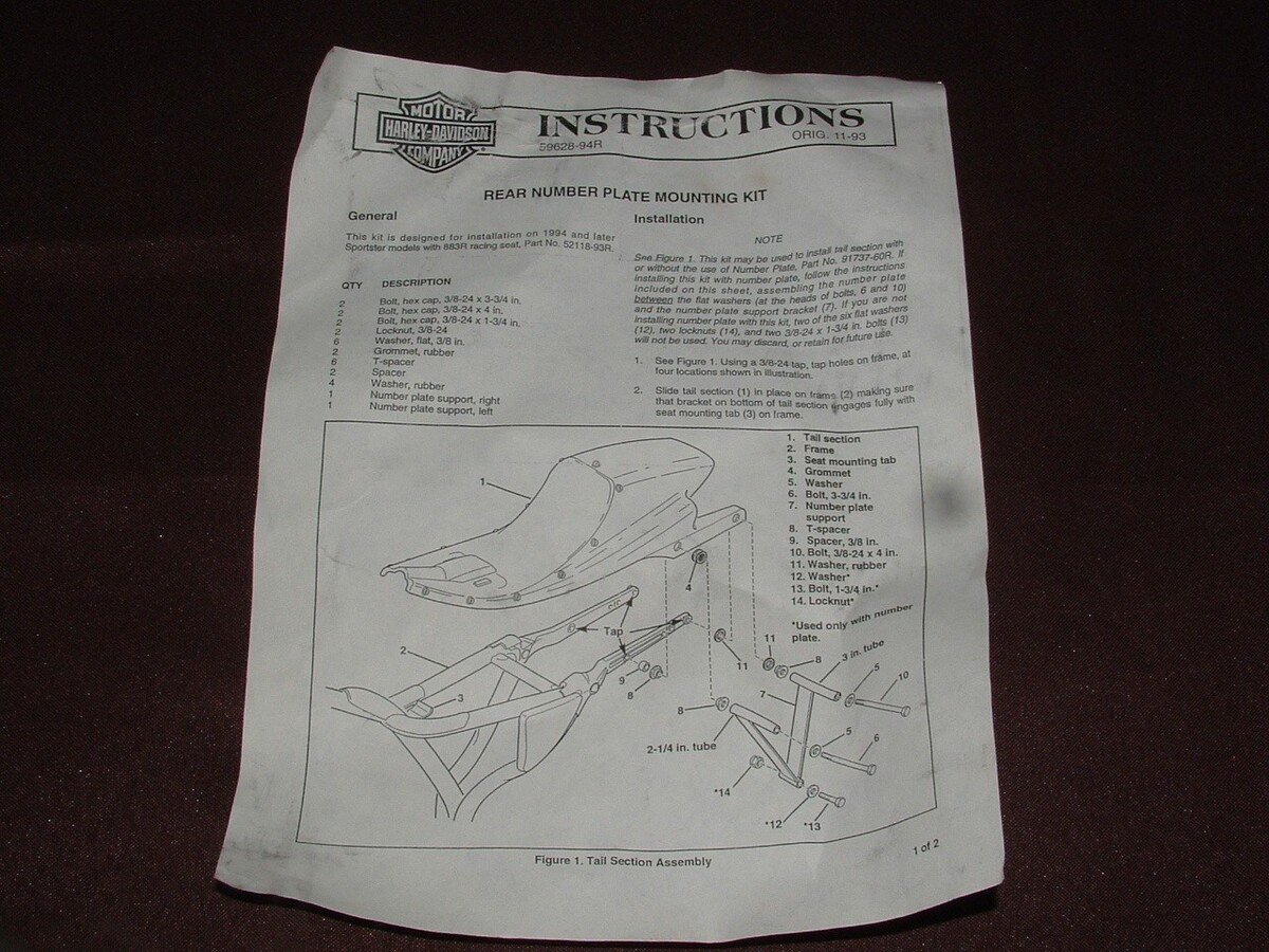 Harley Davidson tail section bracket kit. Part number 59628-94R. This is what Harley is calling rear number plate mounting kit. Fits 1994 and up Sportster 883R with the racing seat. How far up in model years this will fit I do not know. This is a new kit thats been on the shelf for decades. Mounting hardware and instructions come with this kit.