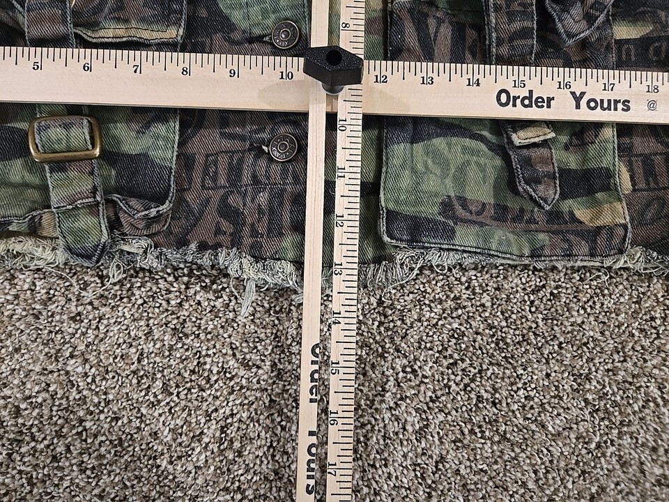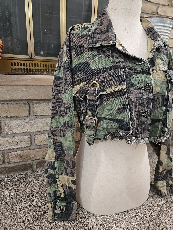 The Taxi Vtg 90s Cropped Camo Denim Jacket is a stylish and versatile piece for women in size medium. Made with cotton denim, this jacket features a button closure, long sleeves, and a collared neckline. The cropped length adds a modern touch while the camo pattern, utility pockets, and frayed hem give it a trendy grunge-inspired look. Perfect for various occasions like travel, parties, casual outings, or workwear, this jacket is a must-have for those who appreciate military-inspired fashion with a hint of hip hop nostalgia.