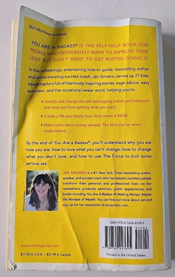This book is a self-help book written by Jen Sincero called "You Are a Badass: How to Stop Doubting Your Greatness and Start Living an Awesome Life". It has 272 pages and is a trade paperback format. The book provides motivational and inspirational guidance on personal growth, happiness, and general advice on how to live a fulfilling life. It was published in 2013 by Running Press and is intended for adult readers.