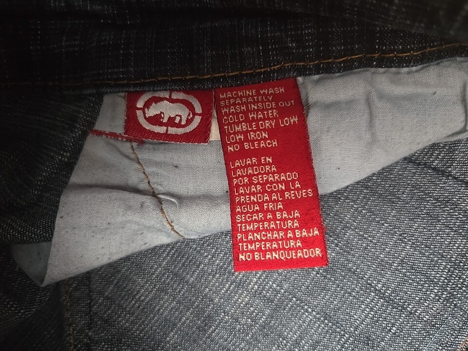 The Ecko Red Y2K Flare Jeans in women's size 9 are a stylish and edgy addition to any wardrobe. These preppy grunge-inspired hipster jeans feature embroidered accents, rhinestone detailing, and a low-rise fit for a trendy look. With a bootcut style and stretch denim fabric, these vintage-inspired jeans are perfect for any season and can be machine washed for easy care. The dark wash and solid blue color make them versatile for pairing with a variety of outfits, while the brand's logo adds a touch of hip-hop flair.
