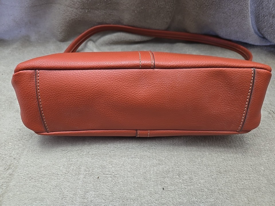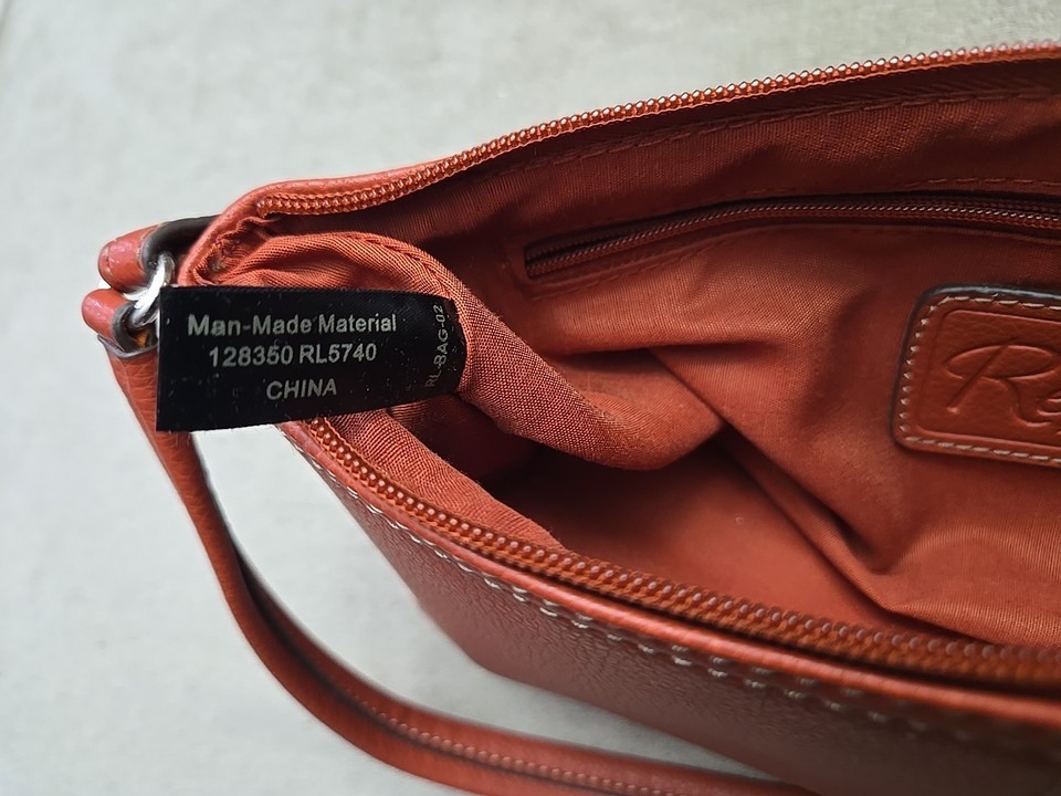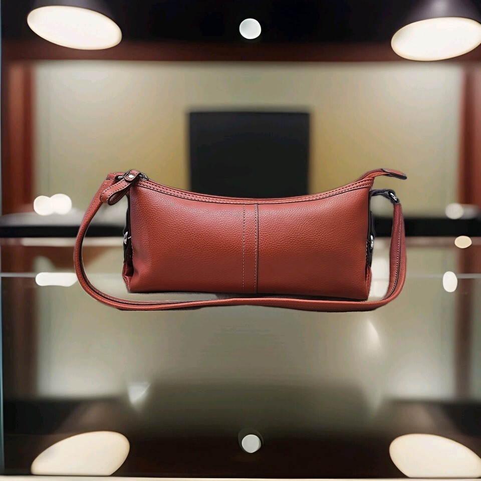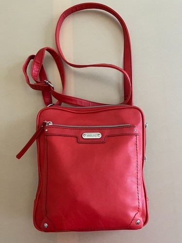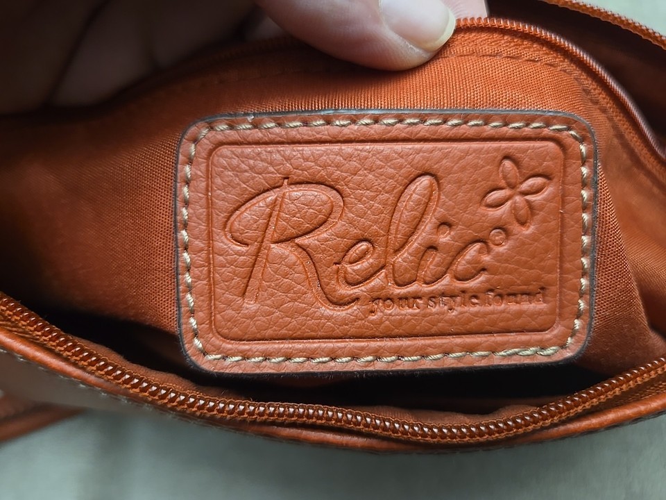 The Relic Shoulder Bag in burnt orange is a stylish small purse perfect for various occasions including weddings, parties, casual outings, and formal events. Made from faux leather with a solid orange exterior and silver hardware, this rectangular-shaped bag features a zip closure and a matching orange fabric lining. The shoulder strap, also made of faux leather, adds a trendy touch to the classic designer theme of this handbag from the Relic product line. With its compact size and elegant design, this shoulder bag is a versatile accessory for any fashionable woman.