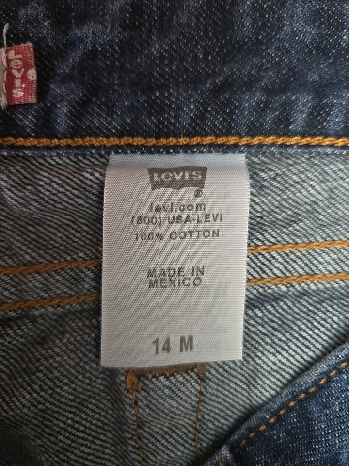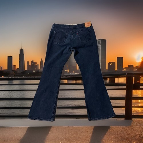 The product is a pair of Levi's 2006 Y2K 545 Low Boot Cut Jeans in women's size 14M with a mid-rise fit and a 5-pocket design. These jeans feature a traditional denim fabric type with a medium wash, a solid blue color, and a zipper closure. The design includes accents like a zipper, a 28-inch inseam, and a regular fit. The brand is Levi's, known for its quality and classic style with themes of American cowboy culture and modern rockabilly aesthetics.