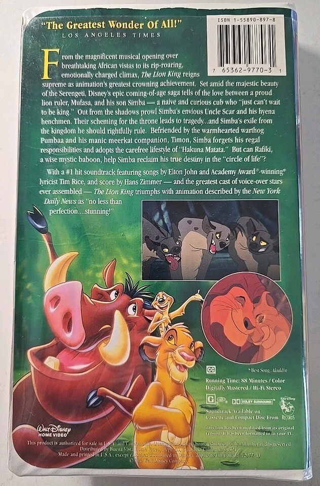 Perfect for collectors and fans of animation and anime, this VHS tape is a must-have for anyone who loves "The Lion King." Directed by Rob Minkoff and Roger Allers, this movie is a timeless masterpiece that will transport you back to a simpler time. Don't miss your chance to own this beloved film on VHS.