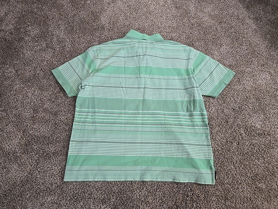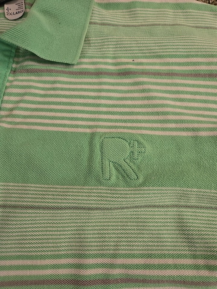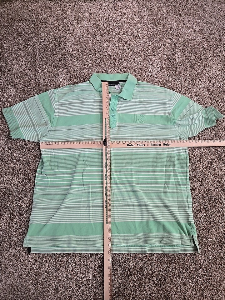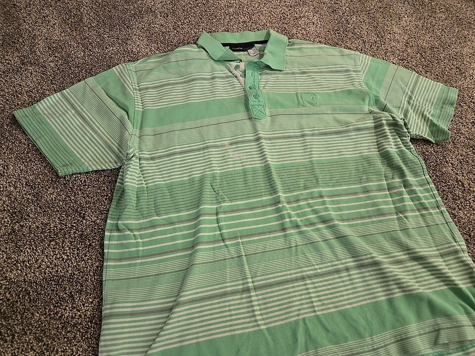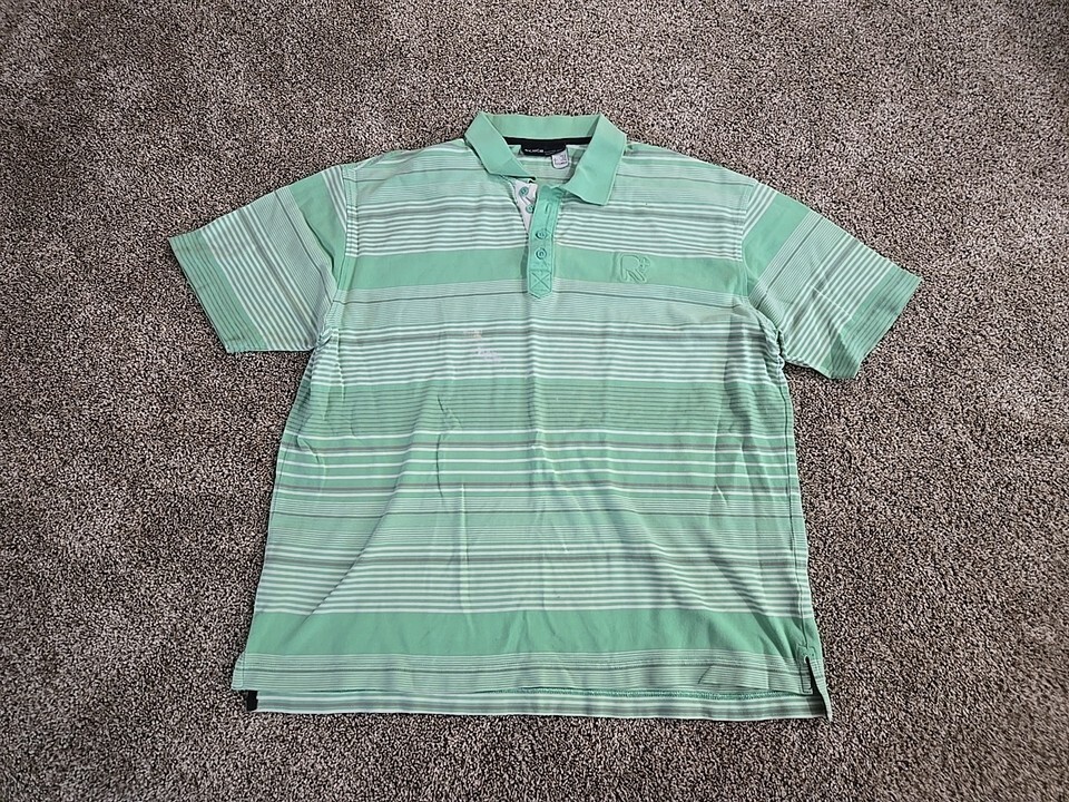 The Rocawear Plus Striped Polo Shirt in men's size 2XL is a stylish hip hop streetwear piece perfect for casual occasions. Made from comfortable cotton knit fabric in a vibrant green color, this polo features a classic striped pattern with a collared neckline and button closure. The relaxed fit and spread collar style offer a modern twist on a classic look, making it suitable for all seasons and various activities such as rugby, walking, and everyday wear. Show off your style with this iconic Rocawear piece.