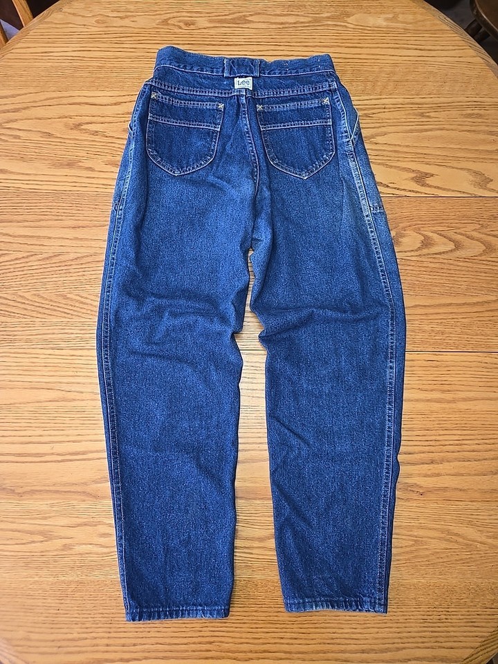The product is a pair of vintage 1980s Lee high-rise jeans in women's size 13, with a tapered chore pants style. Made in the USA from cotton, these blue jeans feature a classic wide-leg straight tapered look. With a waist size of 28 inches and an inseam of 29 inches, these original Lee jeans are perfect for casual occasions and embody the fashion trends of the 1980s era.