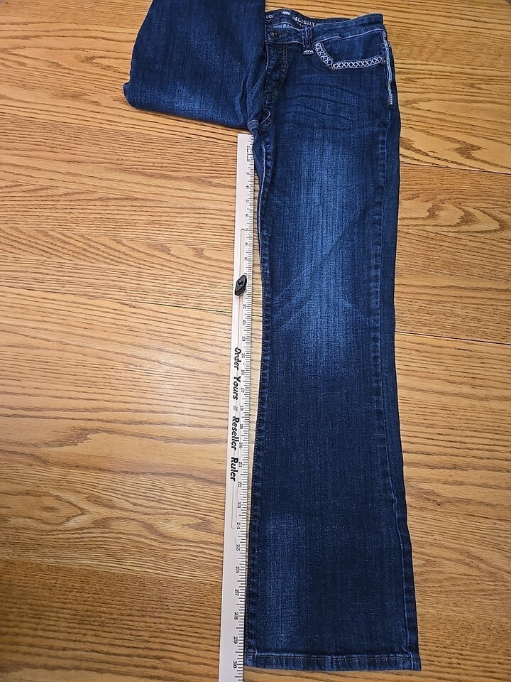 The jeans are made of 60% cotton, 22% rayon, 17% polyester, and 1% spandex, making them stretchable and comfortable to wear in all seasons. They have a 30-inch inseam and a 30-inch waist size. The secretly slender barely bootcut model is machine washable, making it easy to maintain. Get your hands on these stylish and comfortable jeans today!