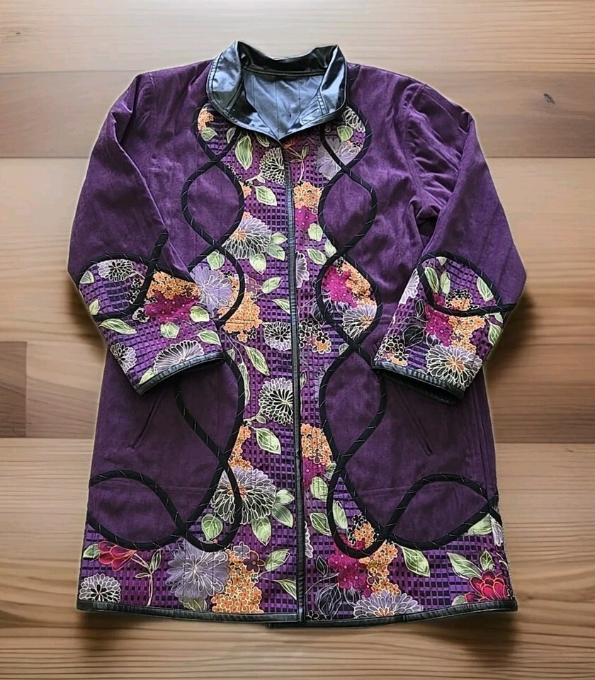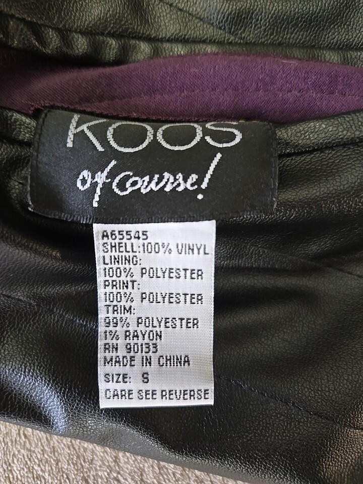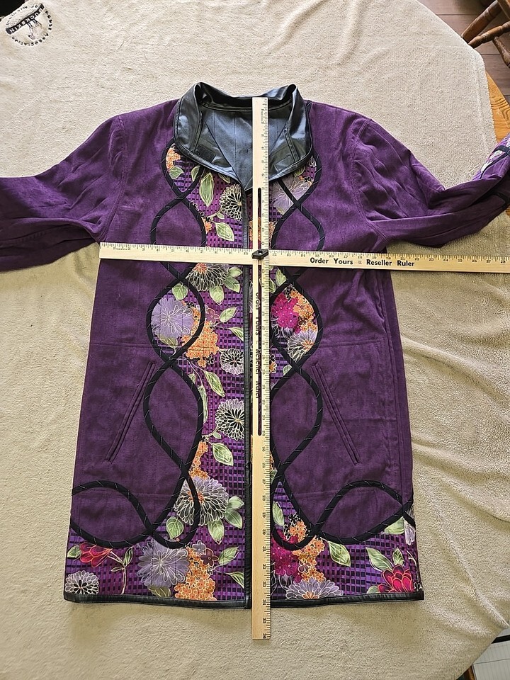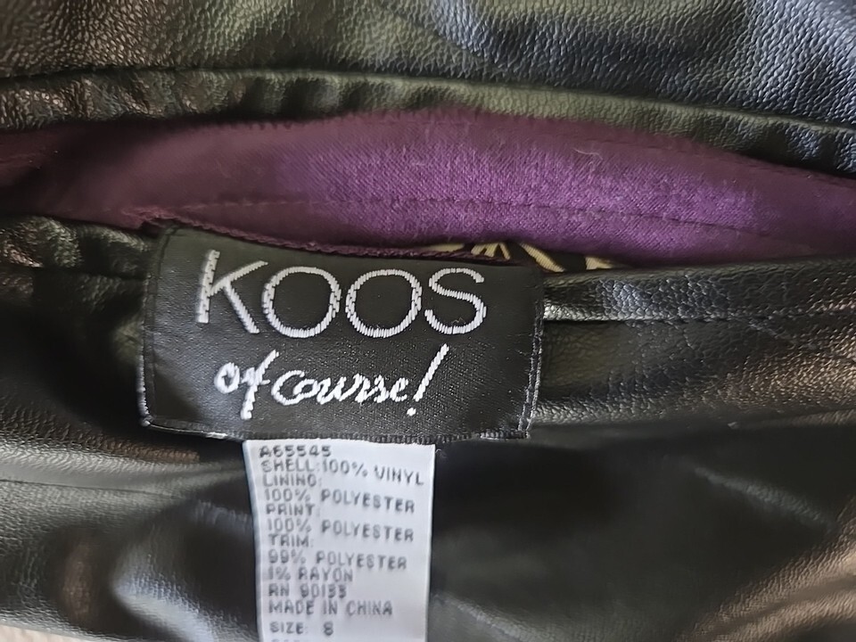 This is a reversible women's jacket from the brand Koos of Course. One side features a purple floral pattern and the other side features a black leather look. The jacket is made of polyester and has a vinyl lining. It has a mid-length cut and long sleeves with a hook and loop closure. The jacket is accented with buttons and pockets, and is designed to be versatile for everyday wear during the summer, fall, and spring seasons. It is available in size small and should be hand washed only.