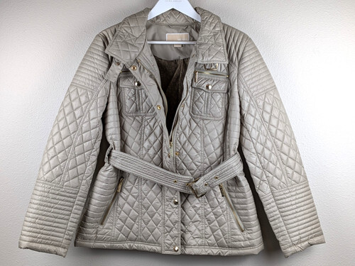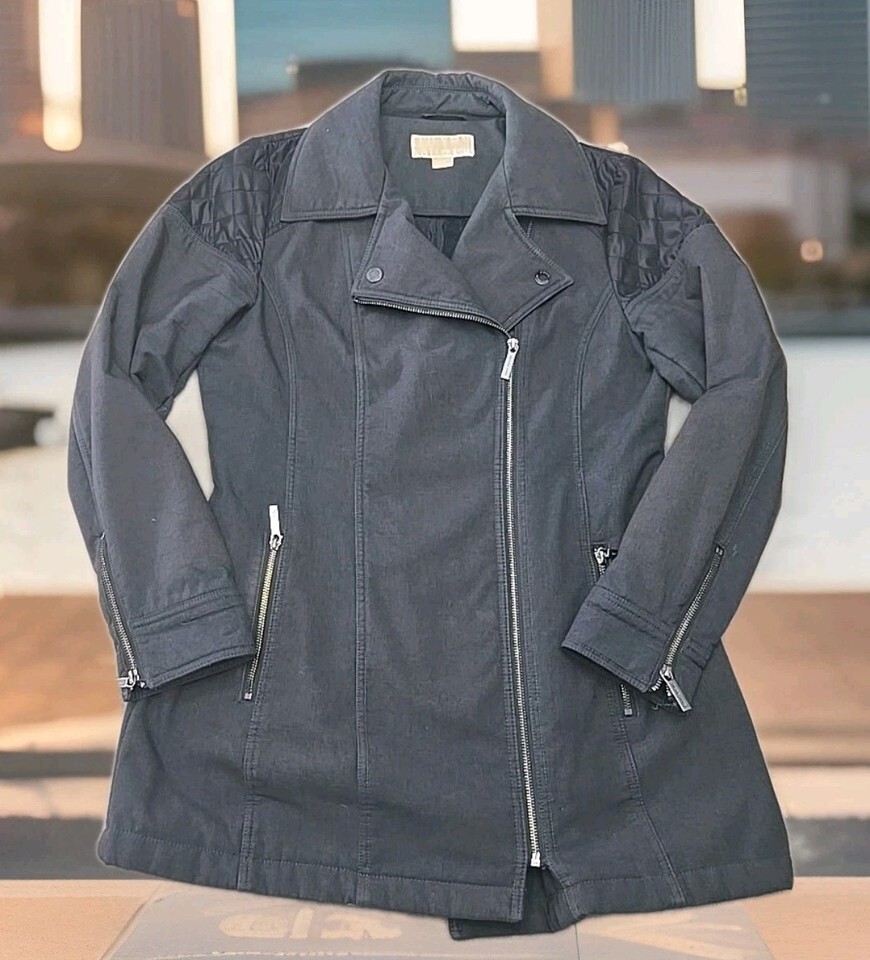 Michael Kors Belted Moto Jacket Womans Sz Medium Charcoal Gray Quilted Shoulder