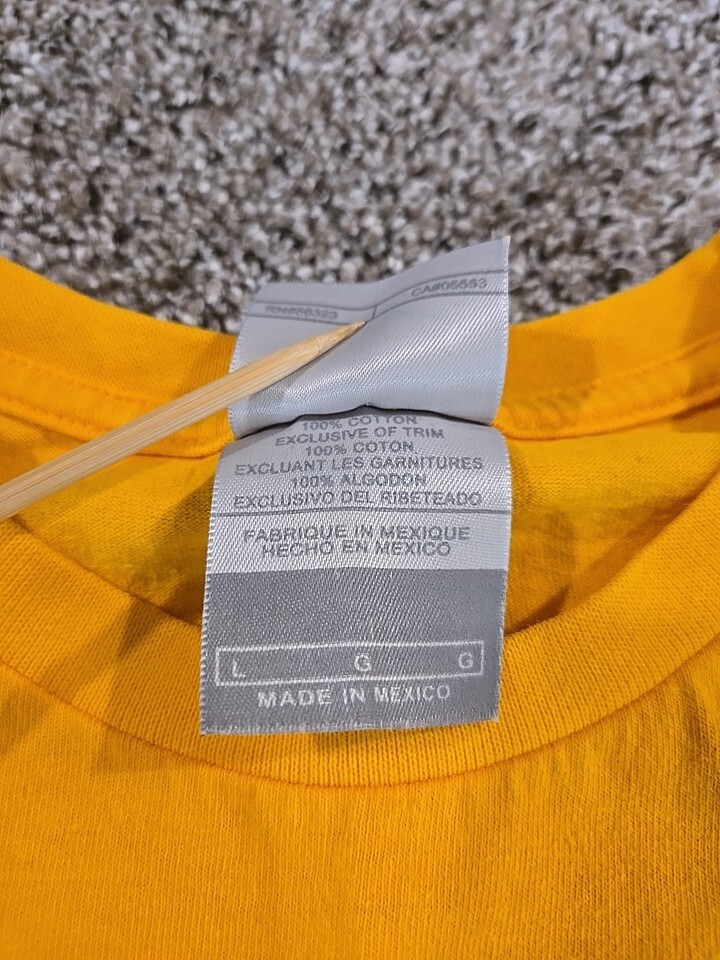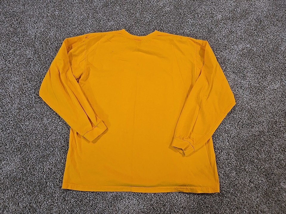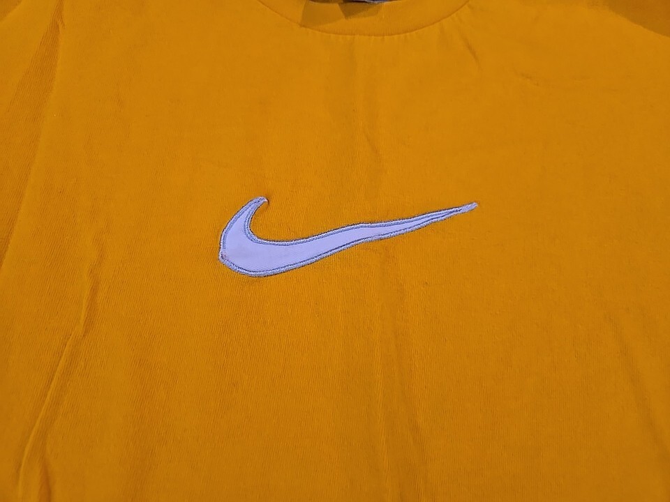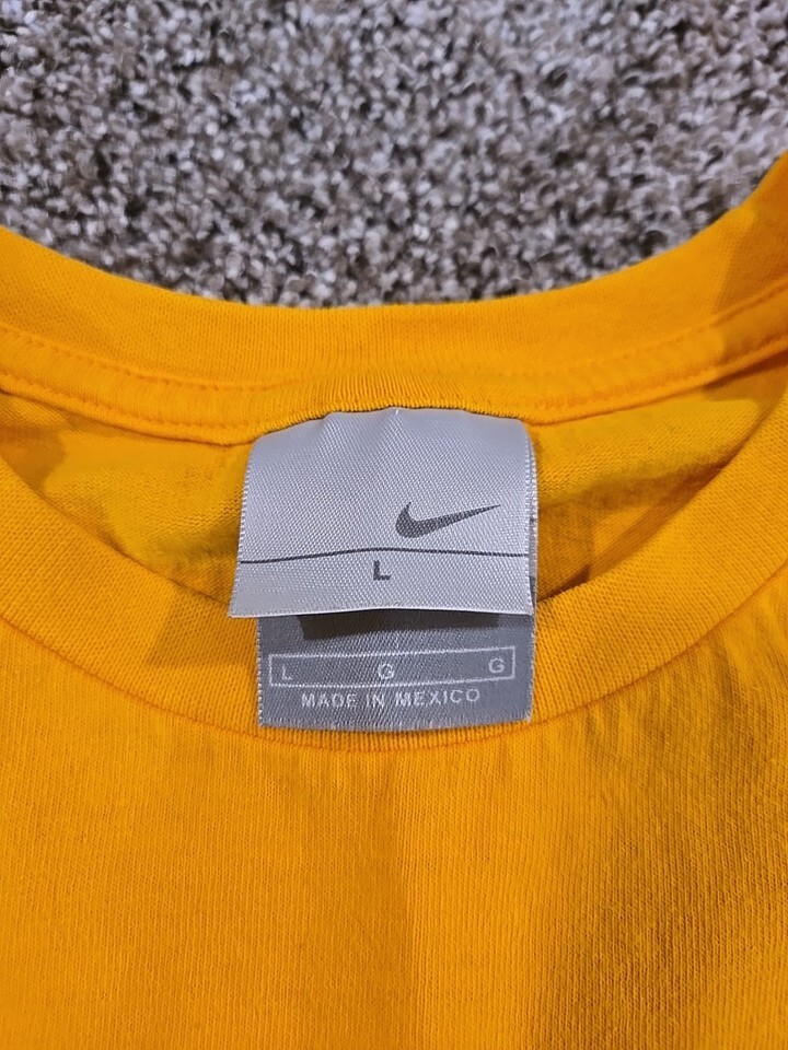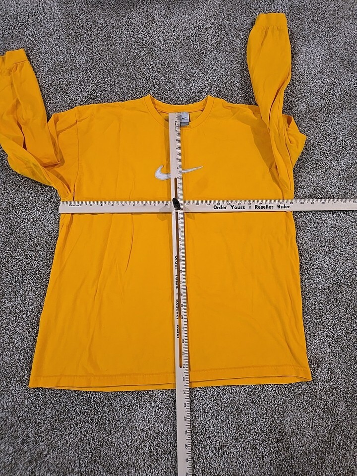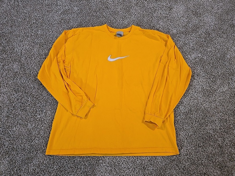 The Nike Vtg Y2K 04 Long-Sleeve T-shirt in men's size Large features an embroidered logo on the sleeve, making it a vintage piece perfect for sports enthusiasts. This yellow shirt is made from cotton and has a crew neck with a regular fit, suitable for all seasons. The classic Y2K design with the Nike Center Swoosh logo adds a touch of nostalgia to the garment, making it a stylish addition to anyone's wardrobe. Machine washable for easy care, this timeless piece is ideal for those who appreciate retro fashion with a sporty vibe.