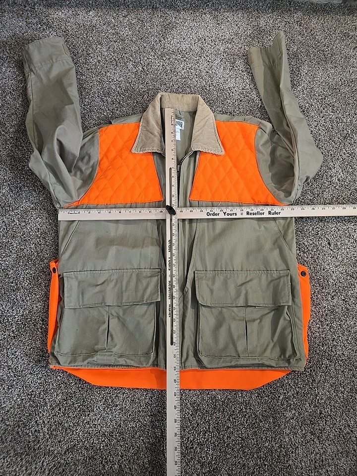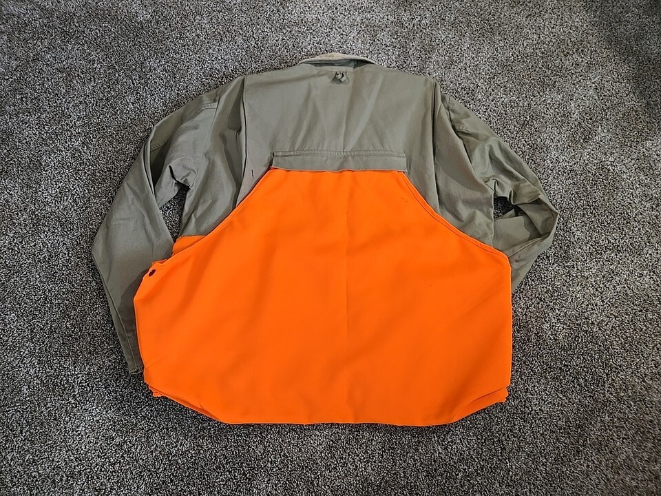 The Bushmaster Vtg Game Pouch Hunting Jacket is a unique and practical piece designed for avid hunters. Made from a durable cotton blend material with corduroy trim, this jacket features a khaki and orange colorblock pattern that adds a stylish touch to your outdoor gear. The game pouch design gives you convenient storage for essential hunting accessories, making it a functional and versatile option for both men and women. Perfect for outdoor activities, this jacket combines practicality with a classic hunting aesthetic.