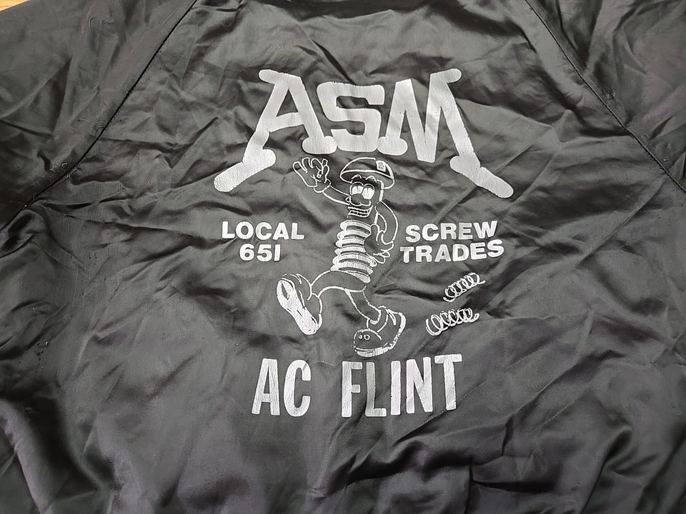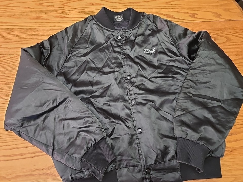 This vintage 80's satin varsity bomber jacket by America's Finest Jackets is a stylish piece of outerwear perfect for casual occasions. Made in the USA, this black jacket features a graphic print design with accents of the name Rich on the front, local 651 screw trades AC Flint on the back. The relaxed fit and short length make it comfortable and on-trend, while the snap closure, polyester lining, and machine washable fabric ensure easy maintenance. With a band collar and pockets, this jacket is a must-have for those embracing a retro, USA-themed look from the 80s and 90s.