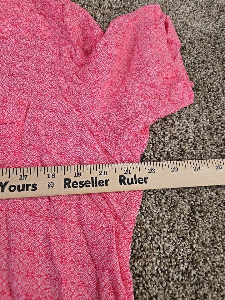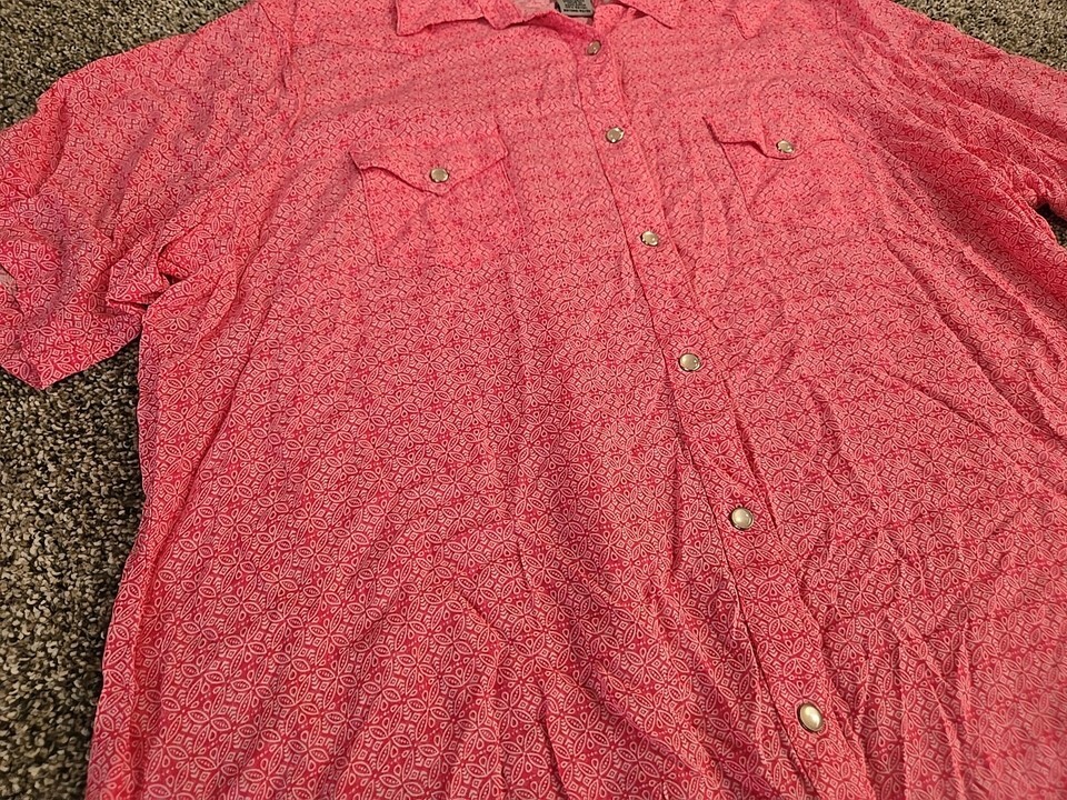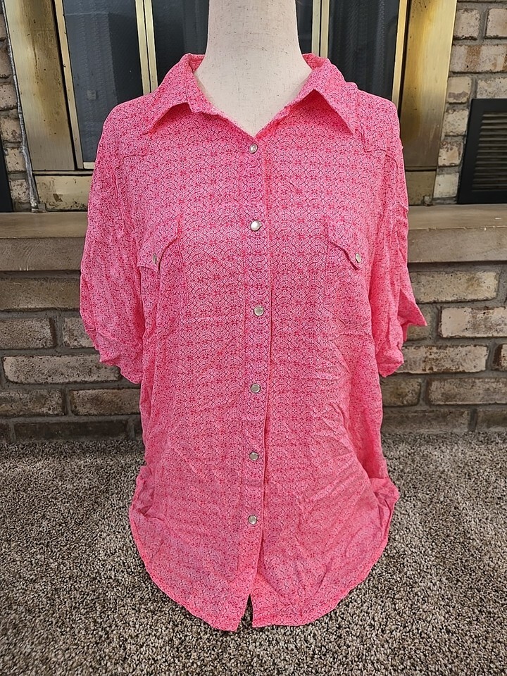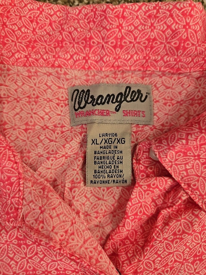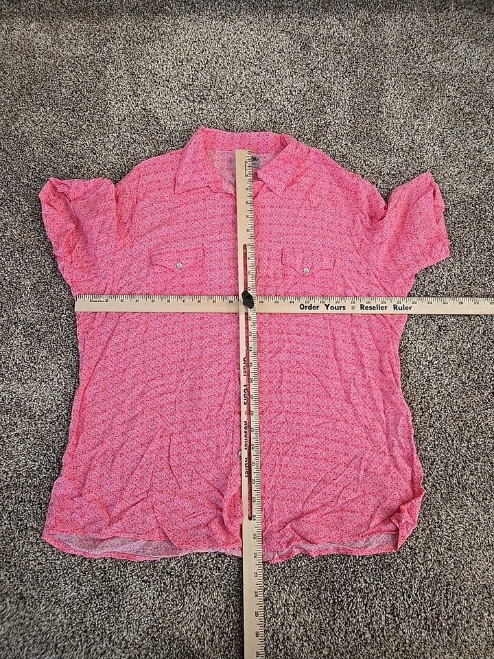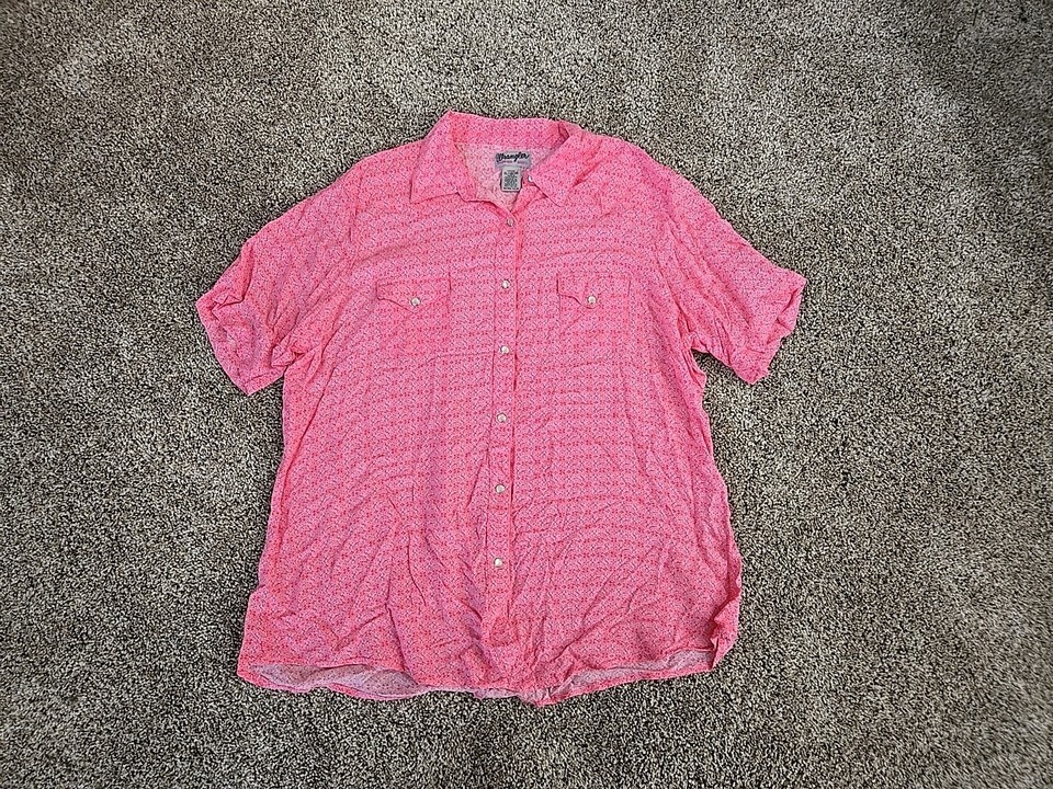 The Wrangler Wrancher Pearl Snap Shirt for women in size XL features a pink paisley pattern, short sleeves, a collared neckline, and snap closure. Made of rayon material, this western rockabilly style shirt can be machine washed and is suitable for various occasions such as party, casual wear, or workwear. With pearl snap accents and a regular fit, this button-up shirt also includes pockets, making it a versatile and stylish addition to any wardrobe for the winter, fall, or spring seasons.