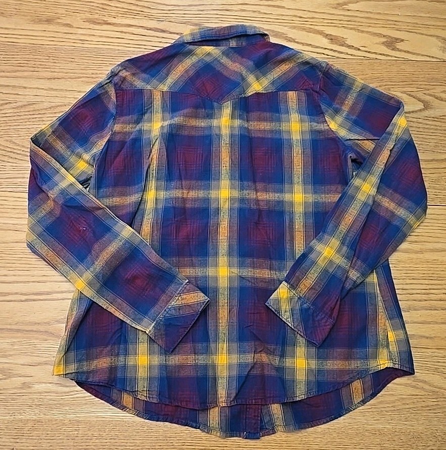 The BKE Buckle Pearl Snap Shirt in women's size large features a classic plaid pattern in a multicolor design. This fitted button-up shirt has a collared neckline, long sleeves, and is made of 100% cotton flannel. Weighing a casual style with a western cowboy theme, this shirt is machine washable and suitable for all seasons, making it a versatile addition to any wardrobe. Perfect for adding a touch of rockabilly flair to your outfit, this shirt also includes a front pocket for added convenience.