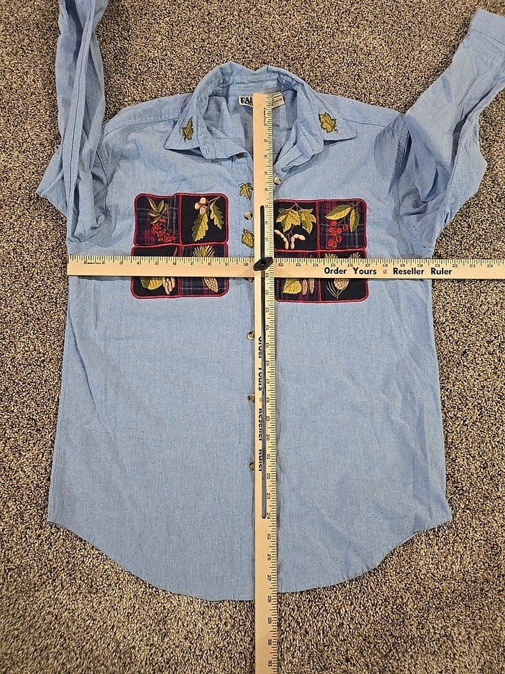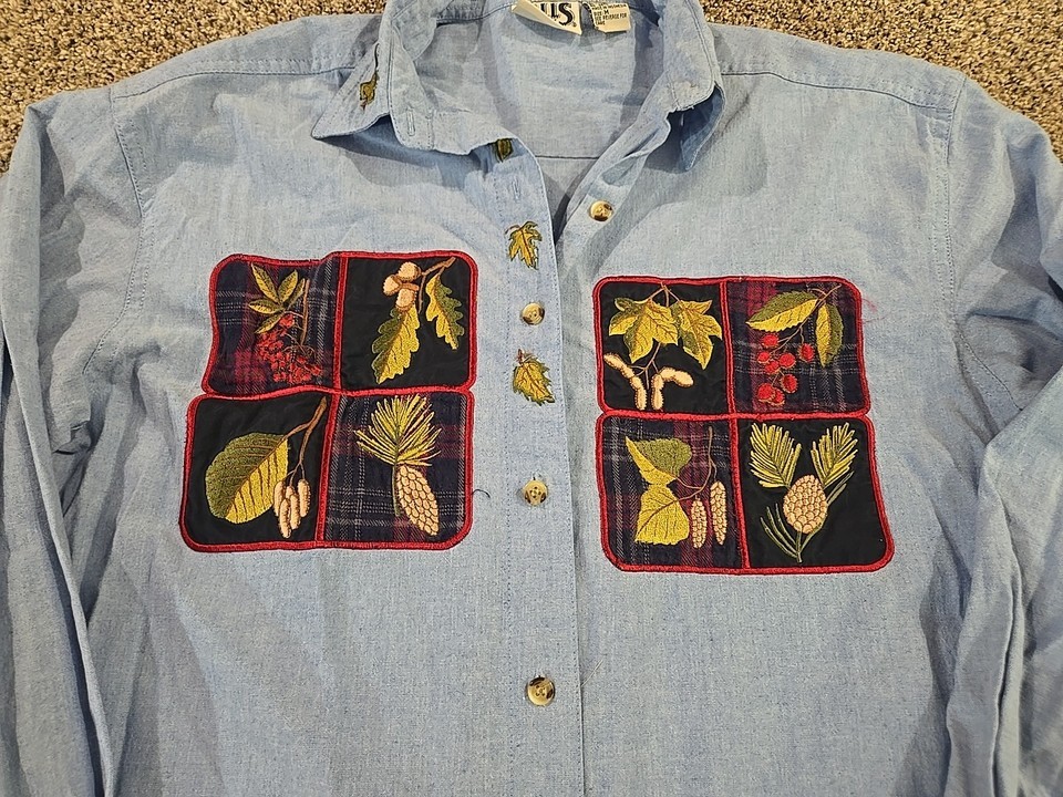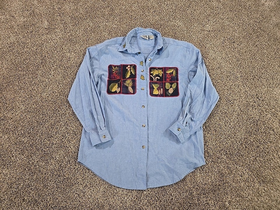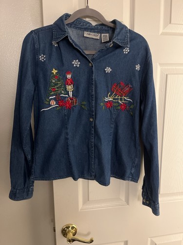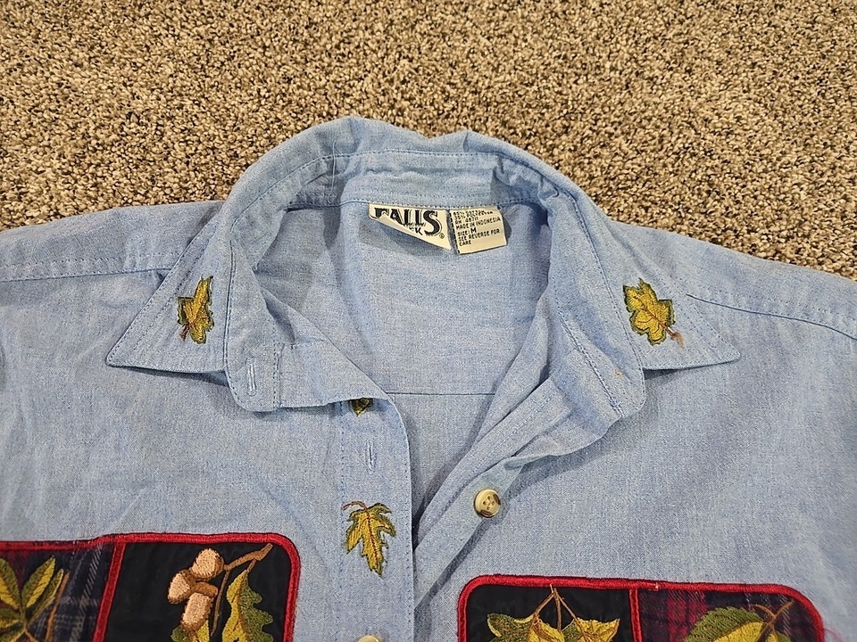 The Falls Creek Vtg Holiday Button-Up Shirt is a festive and cozy addition to any woman's wardrobe. Made from a comfortable cotton blend material with embroidered floral accents, this shirt features a collared neckline, long sleeves, and a button closure. The vintage design, featuring a Christmas and holiday theme, is perfect for the winter, fall, and spring seasons. The medium size and regular fit make it a versatile piece for both casual and party occasions, adding a touch of cottagecore charm to any outfit.