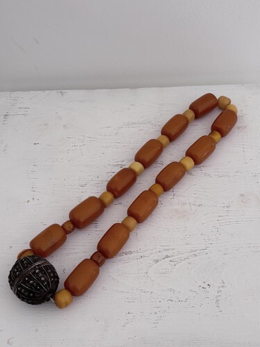Questa e una collana fatta con argento e incorporata con pietre ambrate.