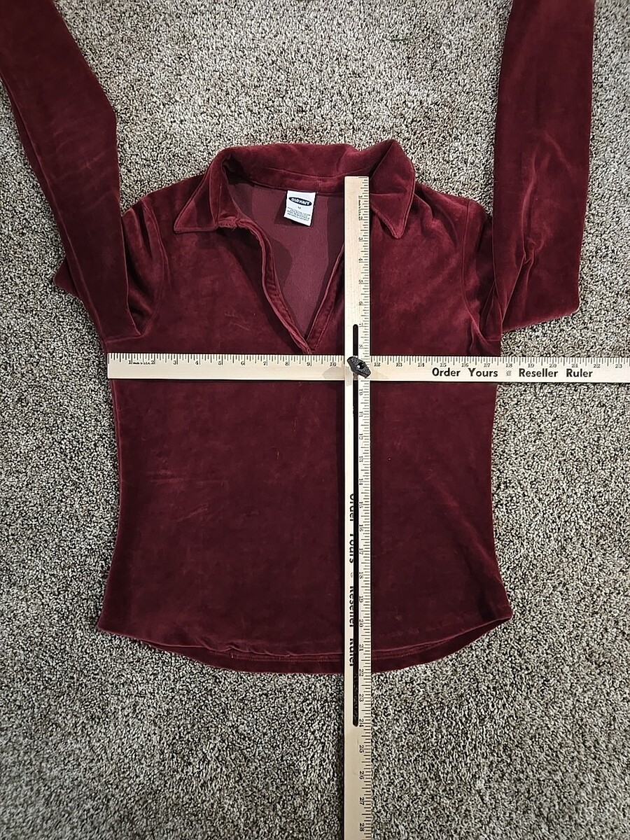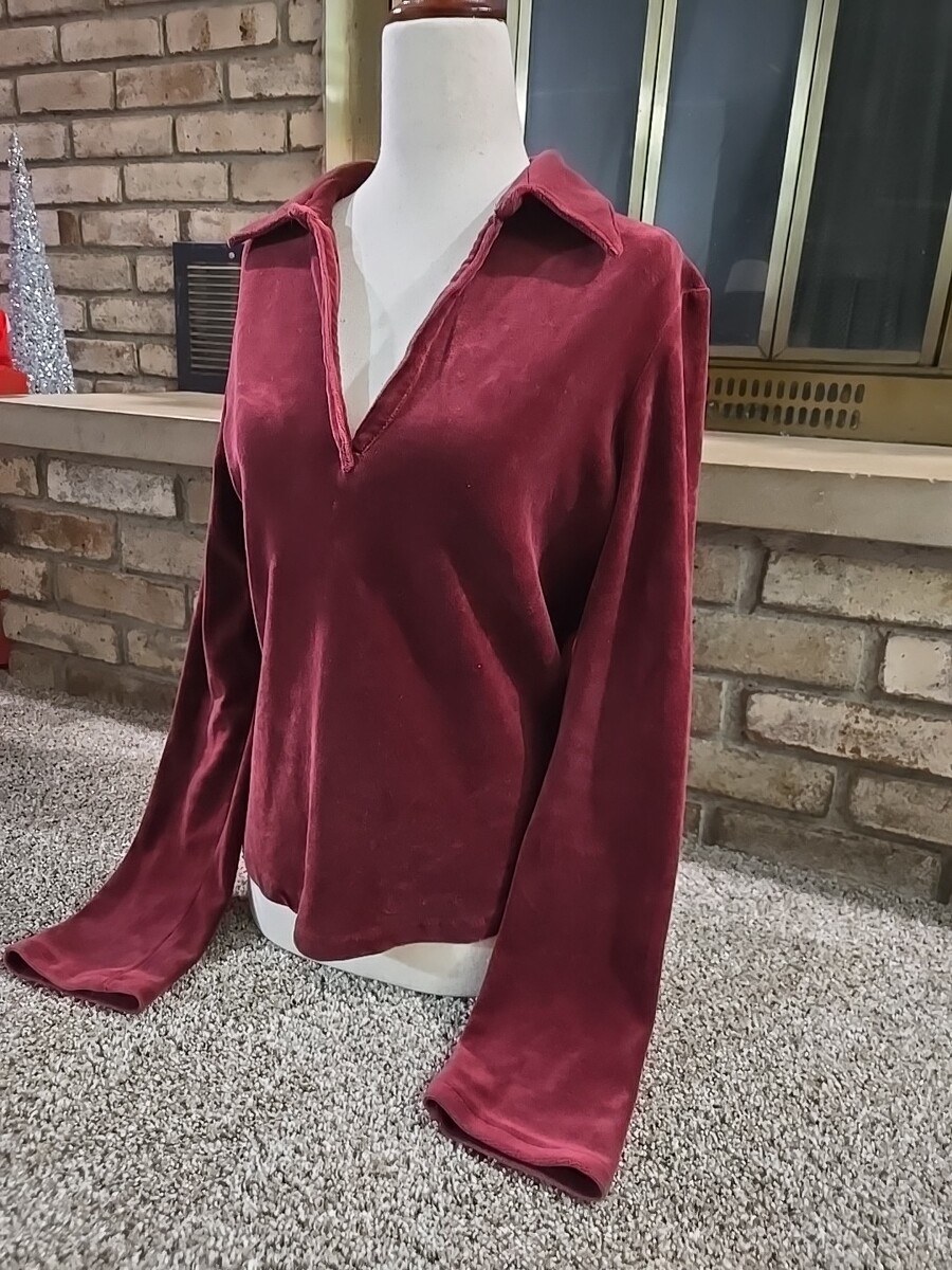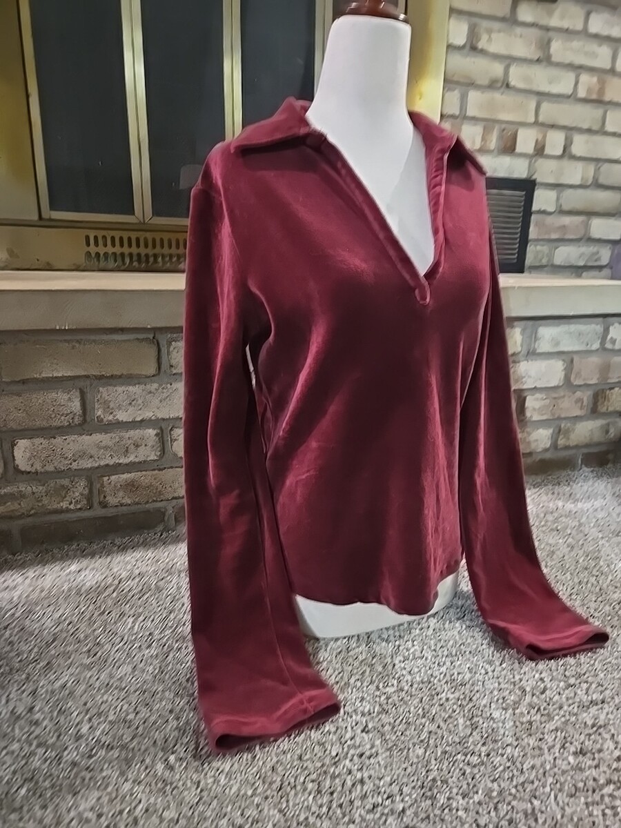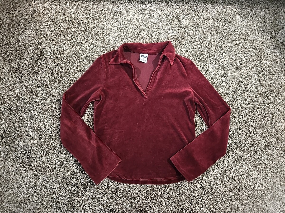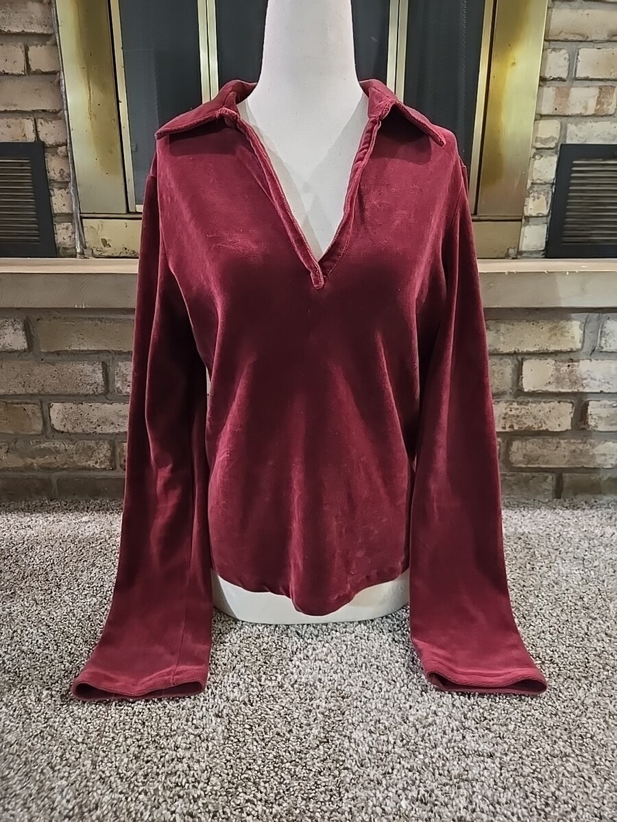 The Old Navy Vtg Y2K 2001 Long-Sleeve Velour Collared Shirt in women's size medium is a vintage piece perfect for those embracing a Gothic, dark, or retro style. Made from a comfortable cotton blend velour fabric, this maroon shirt features a V-neckline and long sleeves, ideal for cooler seasons like winter, fall, or spring. The pullover closure and slim fit add to its edgy appeal, making it suitable for both party or casual occasions with a hint of hipster, punk, or hippie vibes from the 90s era.