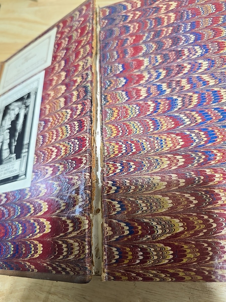?This set features the Deluxe Sheepskin binding with gold-tooled "shoulder strap" emblems on the spines and marbled edges.