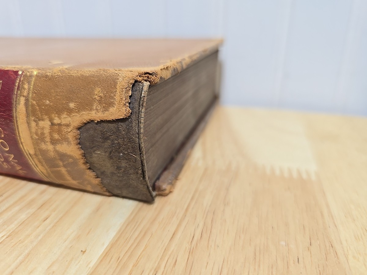 ?Exterior: Fair to Poor condition. The leather is brittle with significant loss to the spine material (see photos). Boards are [mention if attached or loose].