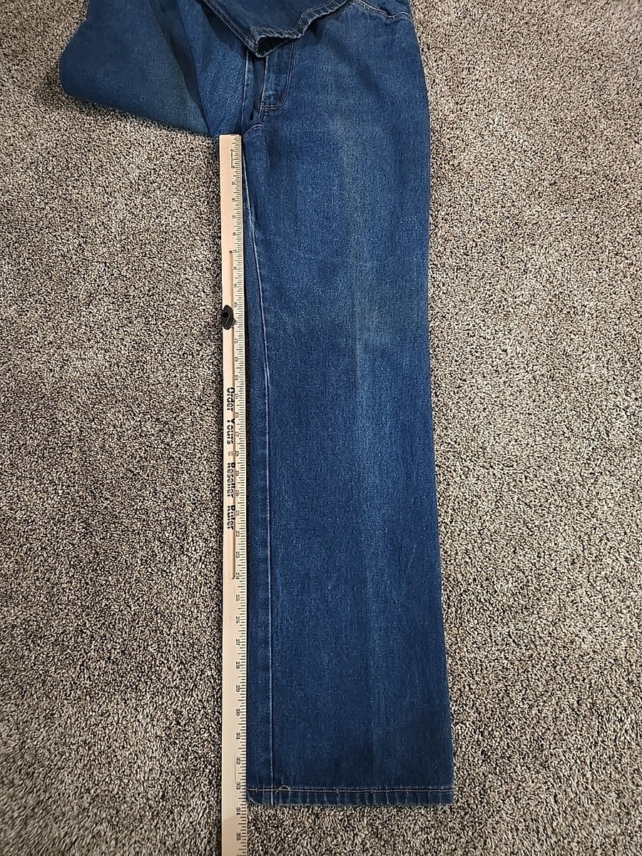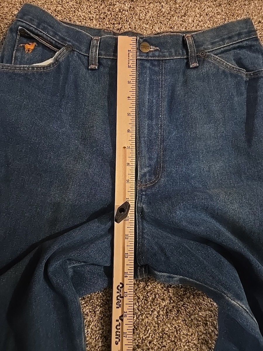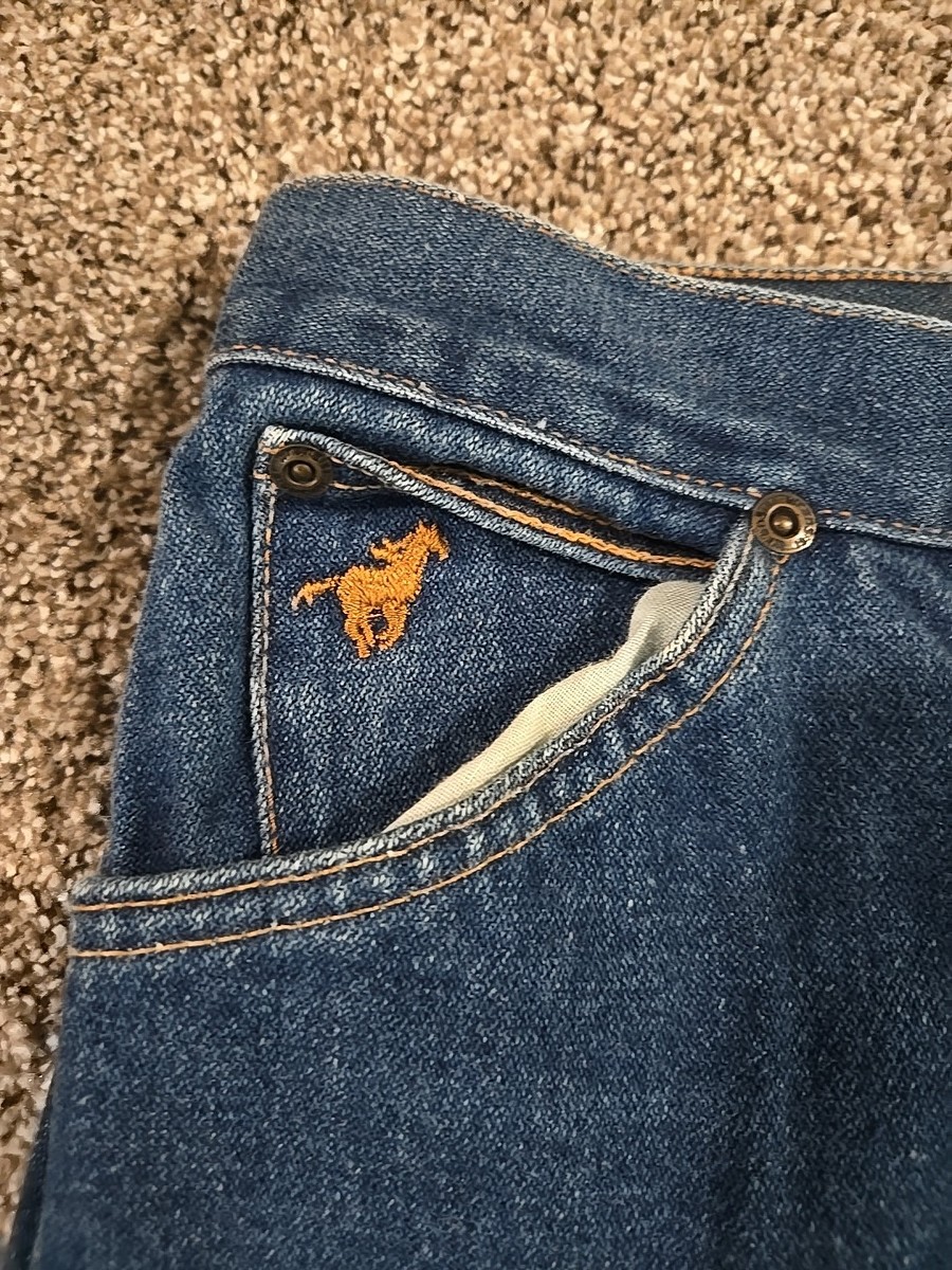 The Wrangler MX695PW Vintage 70s Misses Full Fit Jeans in women's size 16 offer a classic rockabilly style with embroidered Mustang detailing. Made of original denim in the United States, these blue jeans feature a regular fit and a 33-inch inseam. The vintage piece embodies the outdoor occasion of the 1970s, making it a unique and stylish addition to any wardrobe.