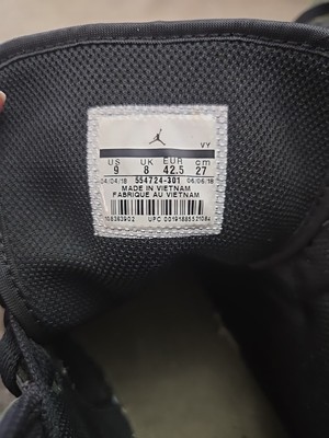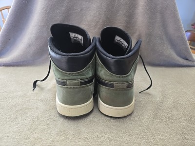 The product is a pair of Nike Air Jordan 1 Retro High Shoes in men's size 9. These sneakers are designed for basketball and outdoor sports, with a lace-up closure and a mid-top shoe shaft style. The shoes feature a rubber outsole, canvas upper material, and a foam insole for comfort. The color is olive with a solid pattern, suitable for all seasons. These athletic shoes are part of the original Air Jordan product line and are manufactured in Vietnam. The design incorporates themes of hipster, school, rock, outdoor, city, retro, hip hop, logo, and sports.