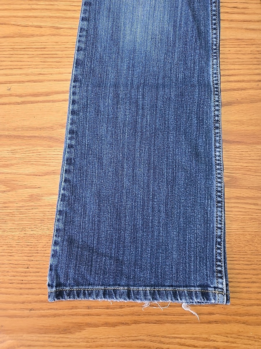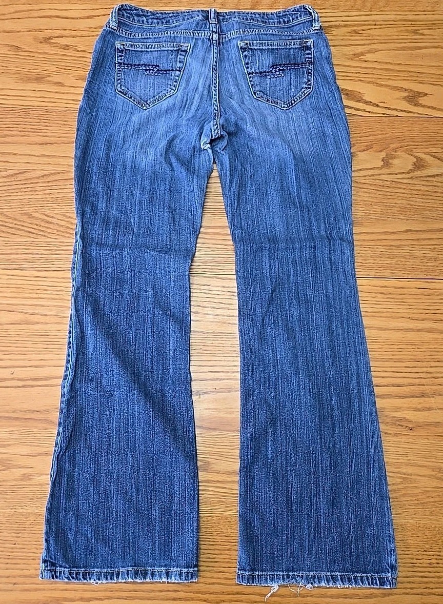The Arizona Jean Co Favorite Bootcut Jeans in women's size 11 are a stylish choice with a distressed western accent. Made with a denim fabric blend, these jeans feature a low rise, flared style, and a 5-pocket design for a classic look. With a zipper closure and easy care instructions, these jeans are versatile for all seasons and occasions, embodying a designer American cowboy vibe. Perfect for the modern woman looking for a fashionable and comfortable denim option.