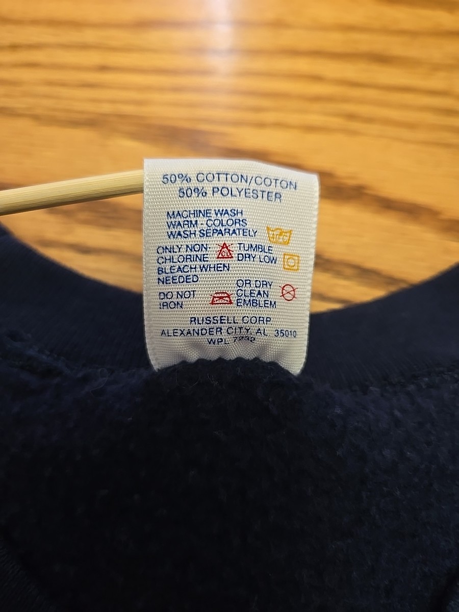 The Jerzees Vtg Eaton Crewneck Sweatshirt in navy blue, men's size XL, is a vintage piece made in the USA. This pullover sweatshirt features a solid pattern with a crew neck design and long sleeves, suitable for winter, fall, and spring seasons. Made from a blend of polyester and cotton knit fabric, this sweatshirt is machine washable and adorned with a graphic print of the USA theme. Ideal for activities like gym training, weightlifting, cycling, and yoga, this regular fit sweatshirt is a stylish and comfortable addition to any wardrobe.