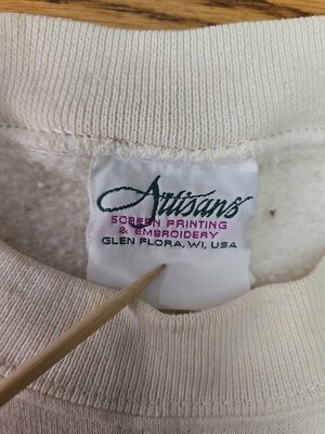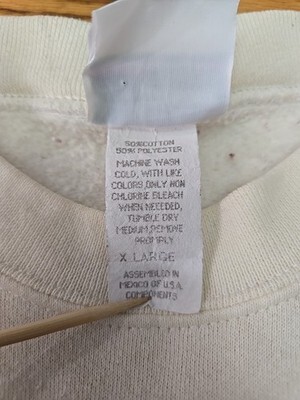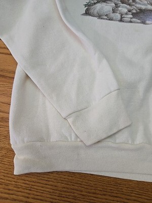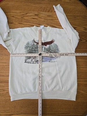 The Artisans Vtg 90's Bald Eagle Crewneck Sweatshirt is a vintage piece featuring a graphic print of a bald eagle on the front, with embroidered accents for added detail. Made from a blend of polyester and cotton fleece, this ivory sweatshirt has a crew neckline and long sleeves for a classic pullover style. With a size XL, this sweatshirt is perfect for men who appreciate nature and USA themes from the 90s. Machine washable for easy care, this sweatshirt is suitable for all seasons and outdoor activities like walking and hiking.