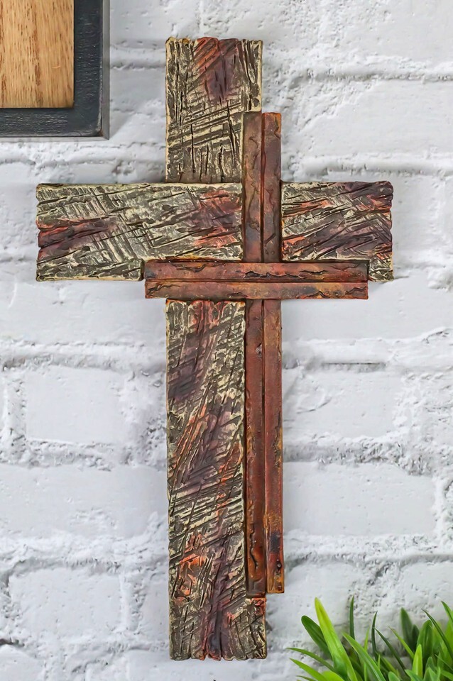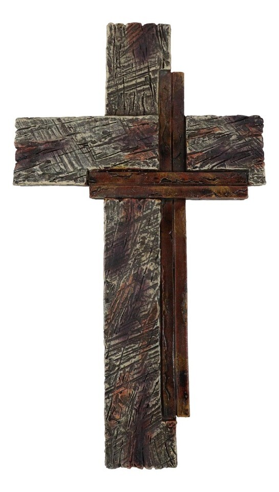 ? This Layered Faux Wooden Rustic Wall Cross Sculpture is made of polyresin, hand painted and polished individually to resemble wood. is made of designer composite resin, hand painted and polished individually. The art of creating a wooden finish to resin is a recently discovered technique which gives you the best of both worlds; the rustic natural feel and look of wood and the sculptural details that can only be achieved with resin. This sculpture will look new for many years to come, and the best part is it will not fade or crack/split (due to dryness) like wood does over a period of time