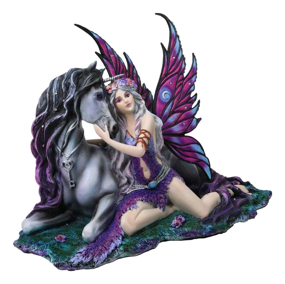 Purple Tribal Fairy Sitting With Midnight Key Lock Dark Unicorn Figurine 14.5"L