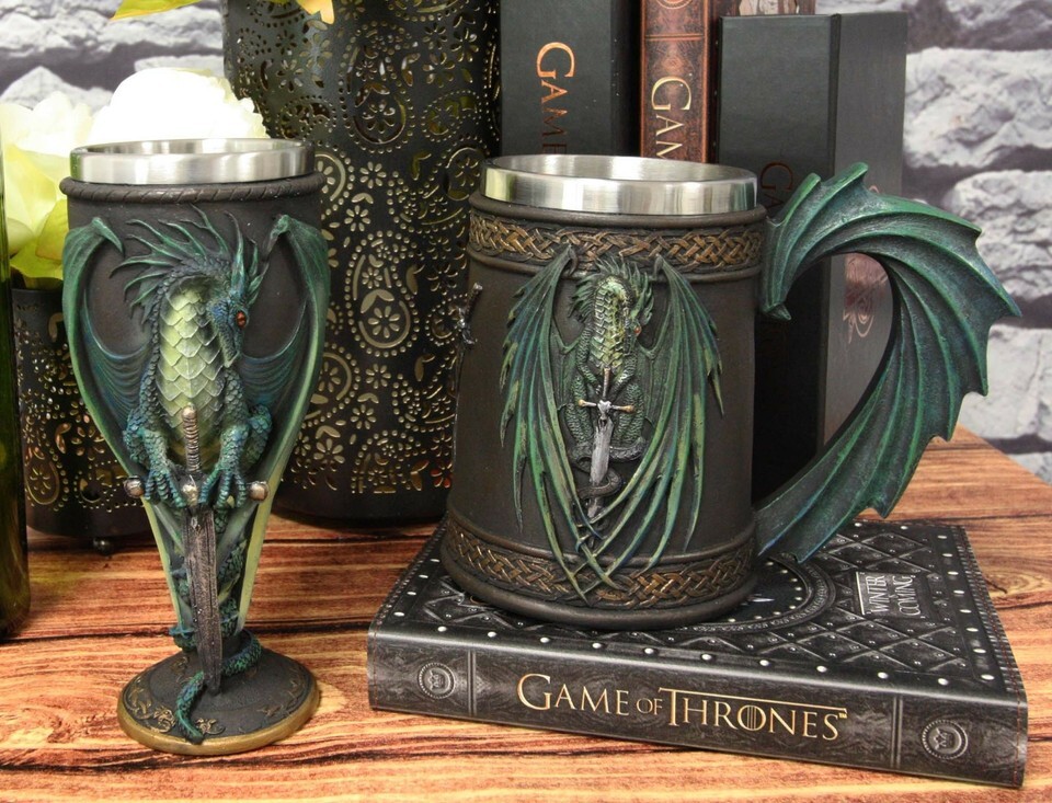 This fantastic tankard and chalice is based upon the fantasy artwork of Ruth Thompson. The design concept features a dragon with emerald green scales and wings, clutching a sword. Celtic knotwork designs curve around the mug as well as the base of the chalice.